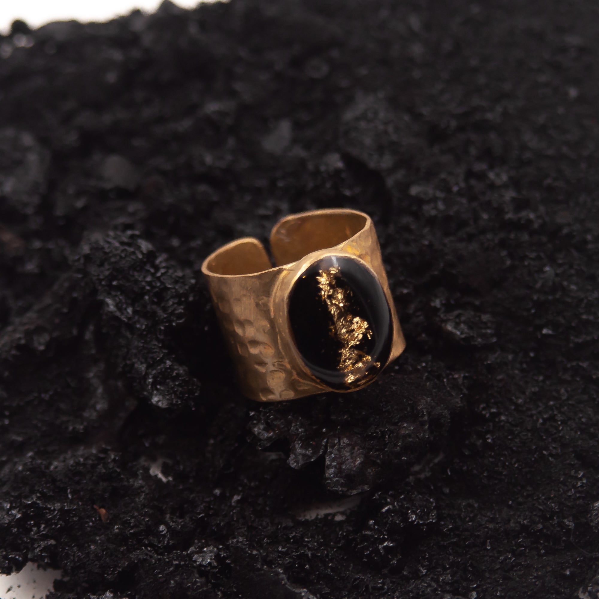 Un gioiello che intreccia oscurità e bagliore. La fascia larga in ottone martellato accoglie un inserto ovale in resina trasparente, dove la fuliggine nera incontra frammenti di foglia dorata sospesi come tracce di luce in un cielo scuro.