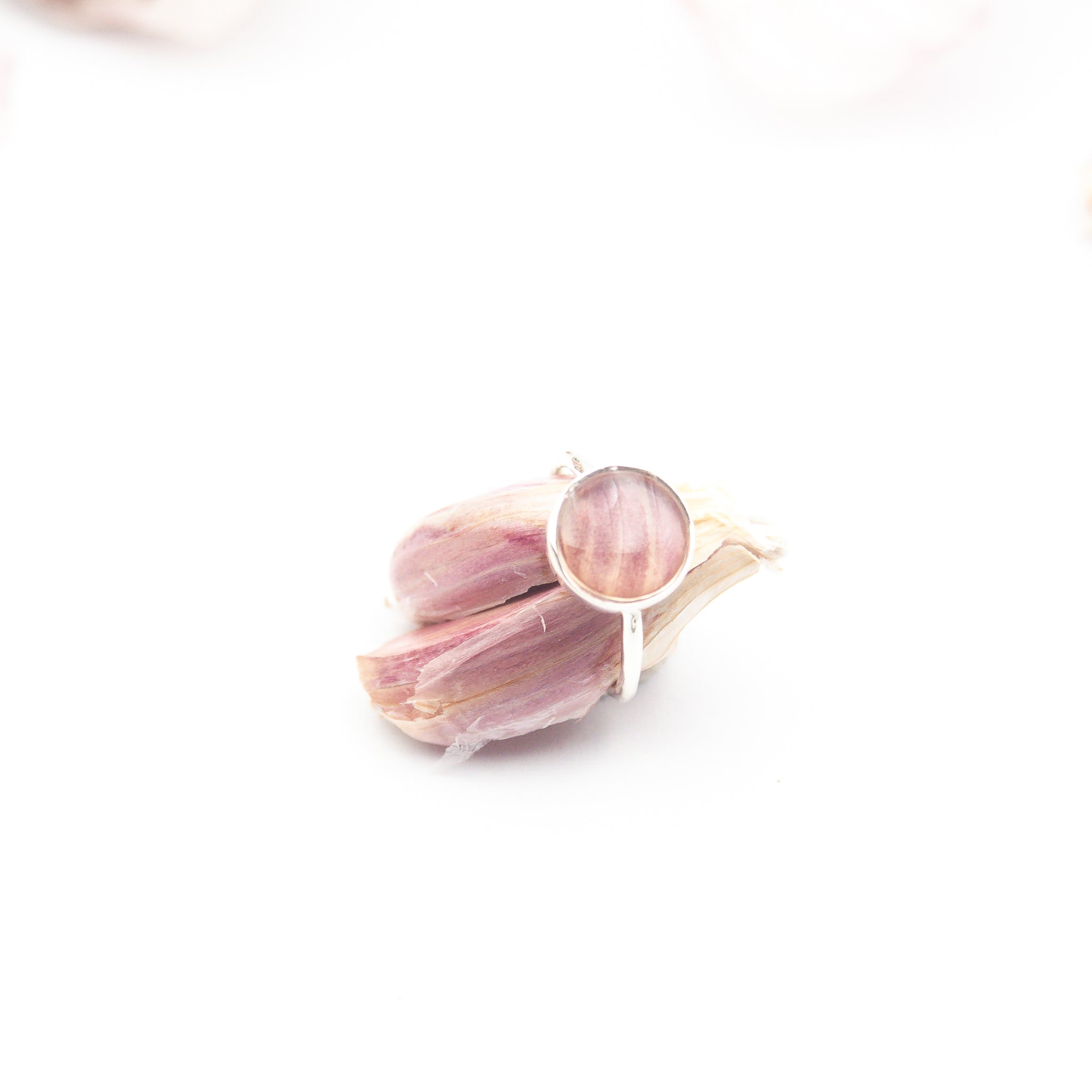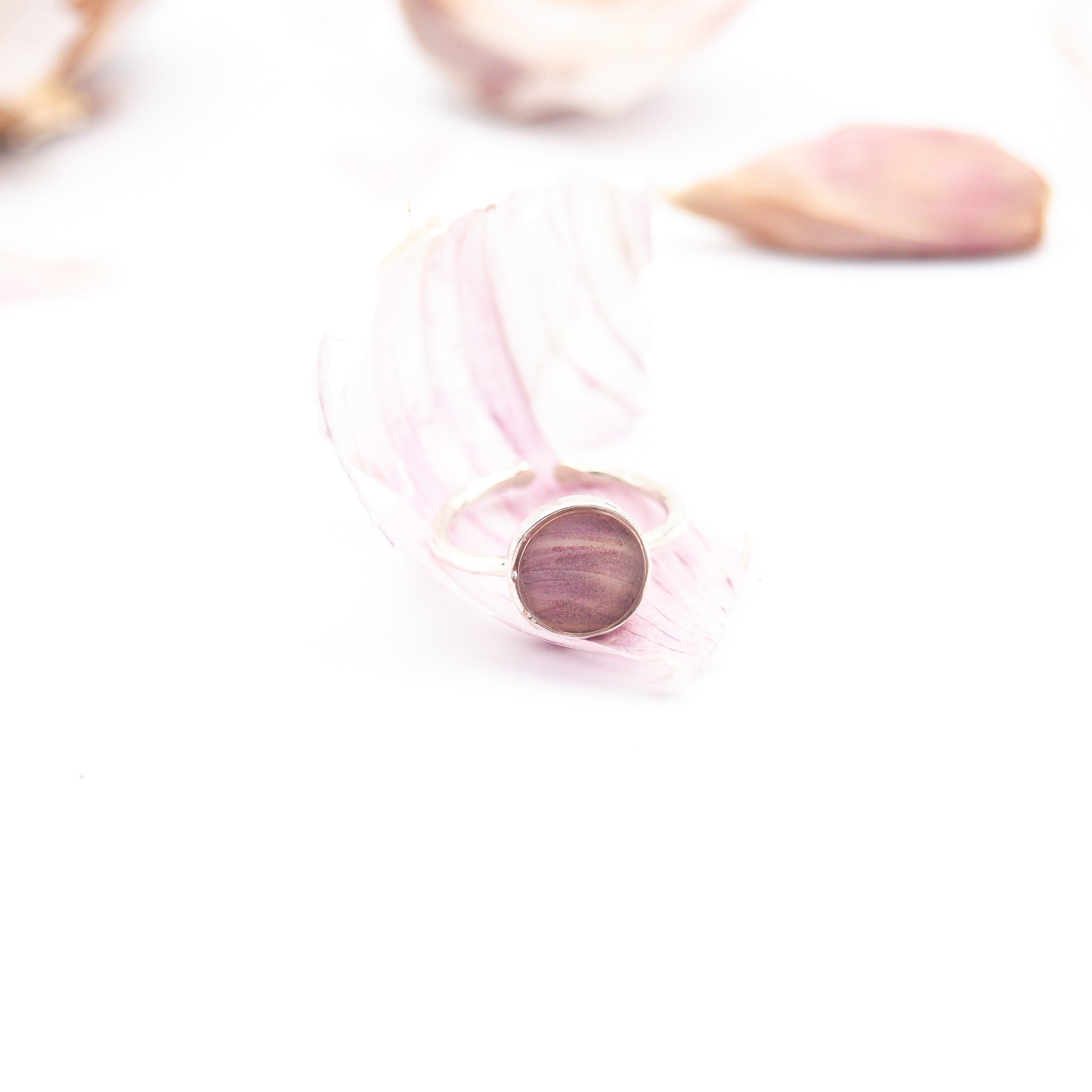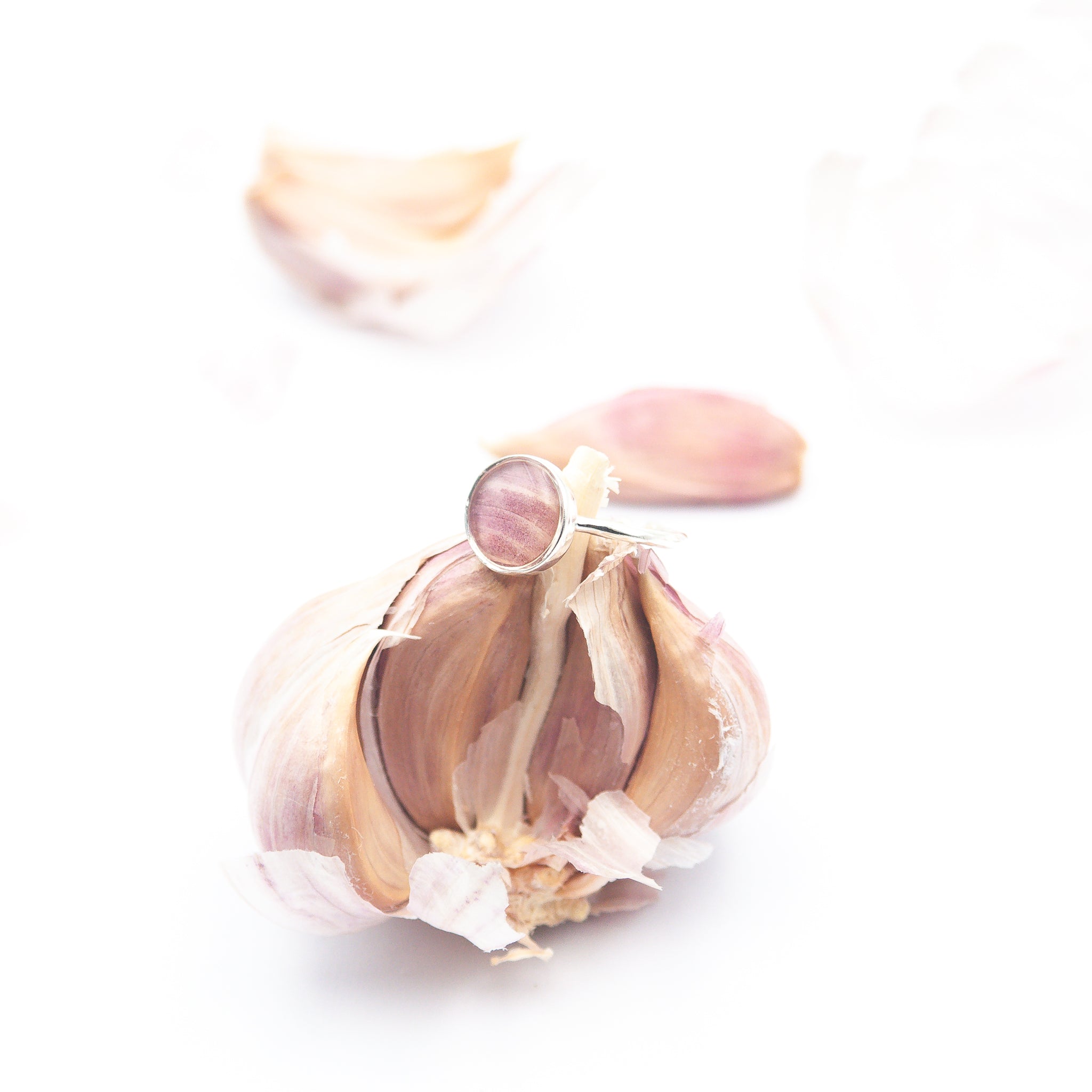 Un talismano segreto nato dall’ingrediente più umile: questo anello custodisce vera buccia d’aglio, trasformata in un dettaglio prezioso dai riflessi iridescenti che variano dal rosato al perlaceo. Un gioiello leggero e sorprendente, che ribalta lo sguardo e dona poesia al quotidiano, sospeso tra tavola e sogno.