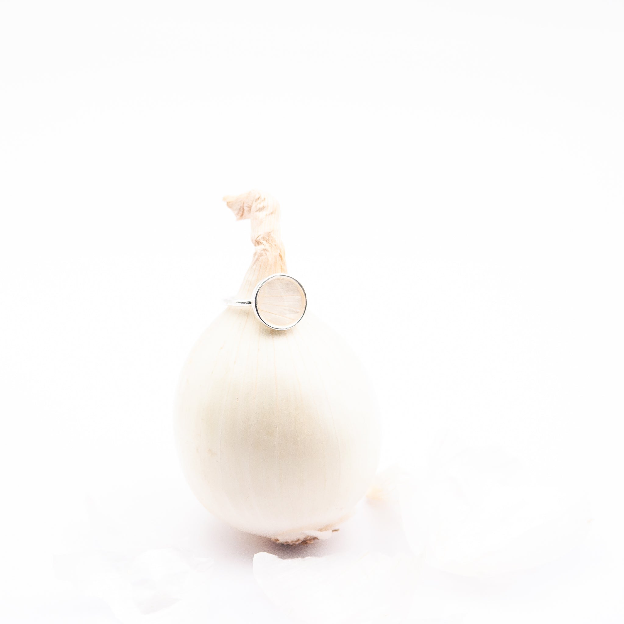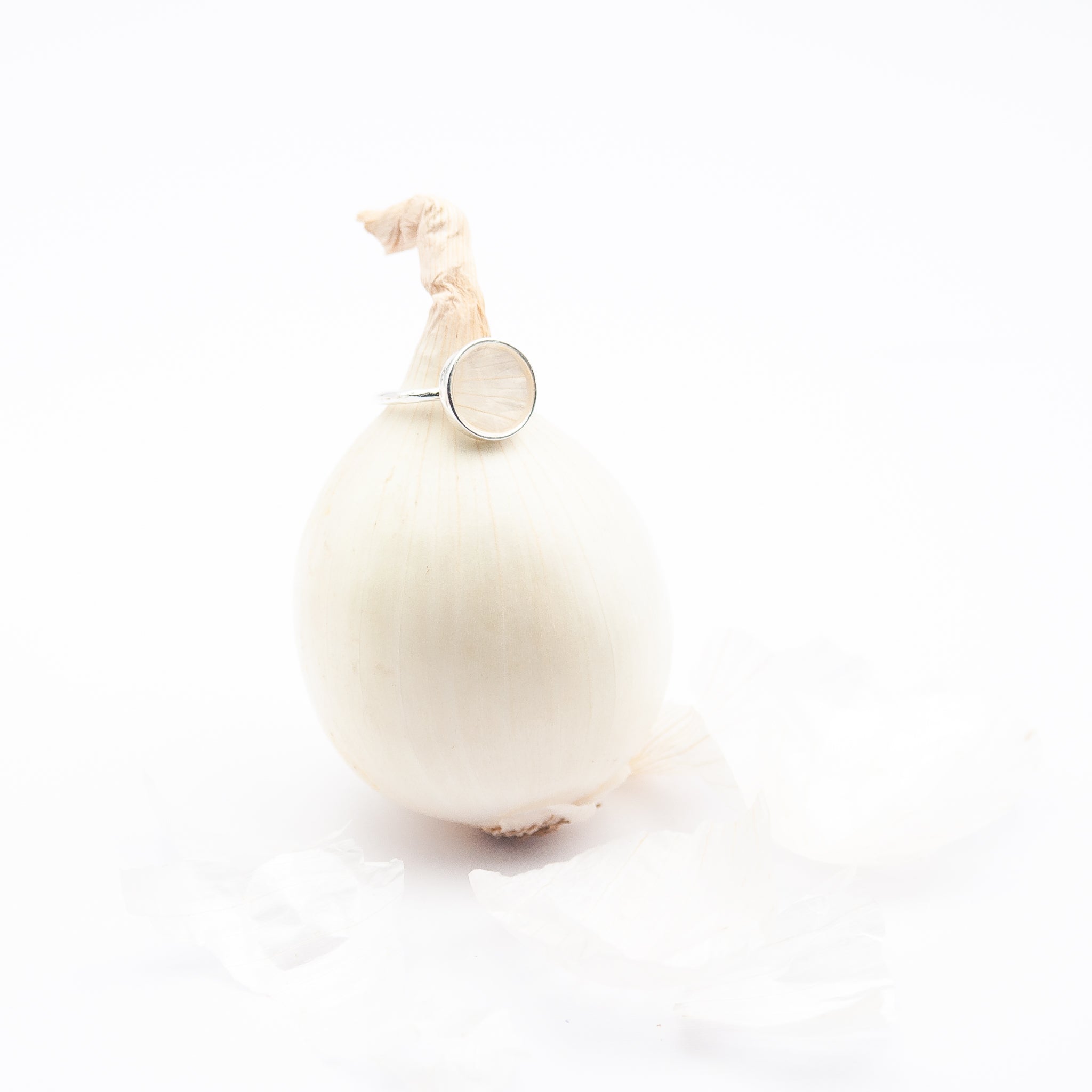 Un anello dal fascino essenziale, in cui la buccia di cipolla bianca si trasforma in una superficie chiara e luminosa, custodita in una montatura in argento. La sua semplicità lo rende un gioiello discreto ma sorprendente, capace di evocare poesia da un dettaglio quotidiano. Un piccolo incanto che racconta l’incontro tra cucina e sogno.