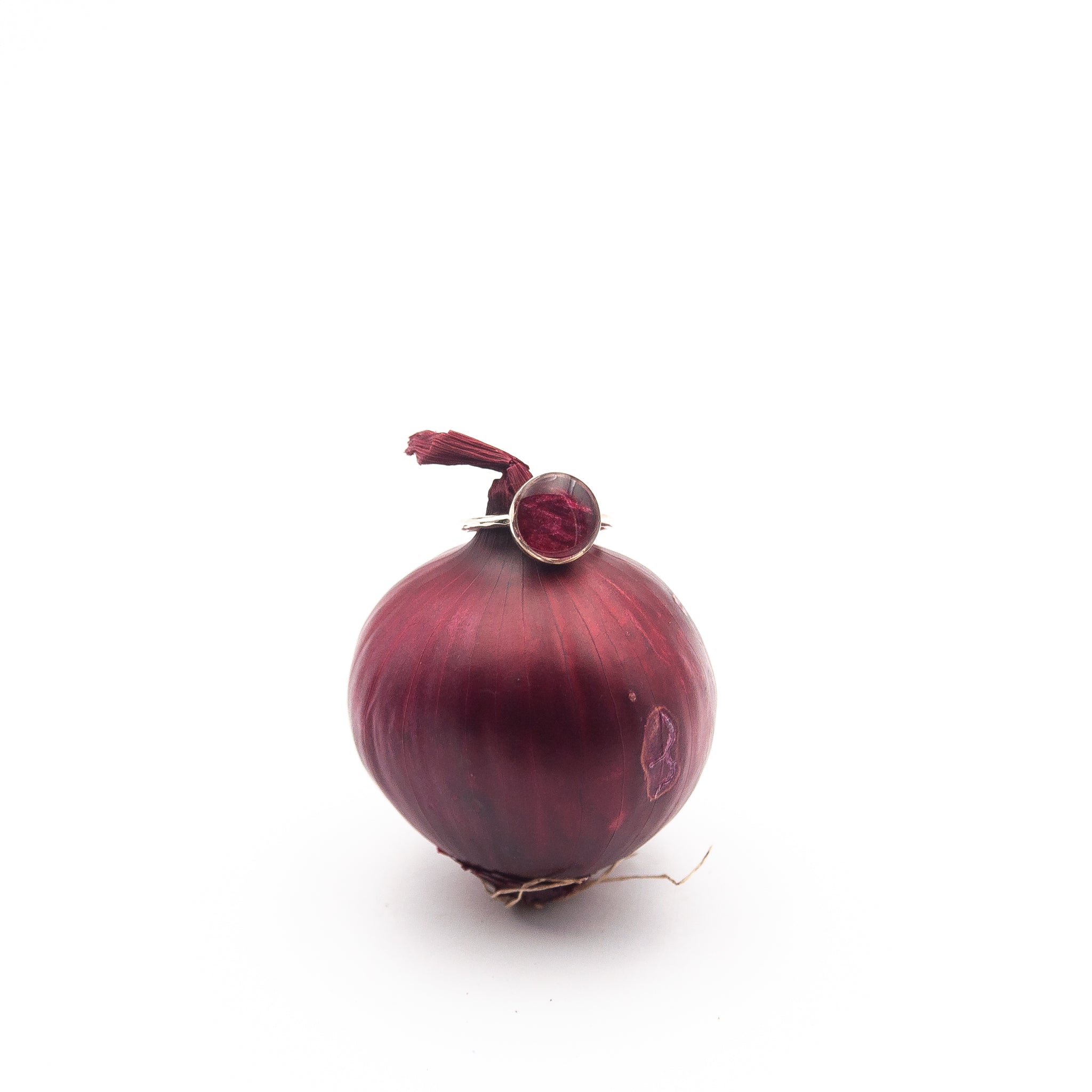 Un anello che unisce quotidiano e meraviglia, trasformando la buccia di cipolla rossa in un dettaglio prezioso. La sua superficie naturale riflette sfumature intense e luminose, che ricordano gemme antiche e segrete. Un gioiello che celebra l’incanto nascosto degli ingredienti più semplici, rendendoli protagonisti di un racconto sospeso tra cucina e sogno.