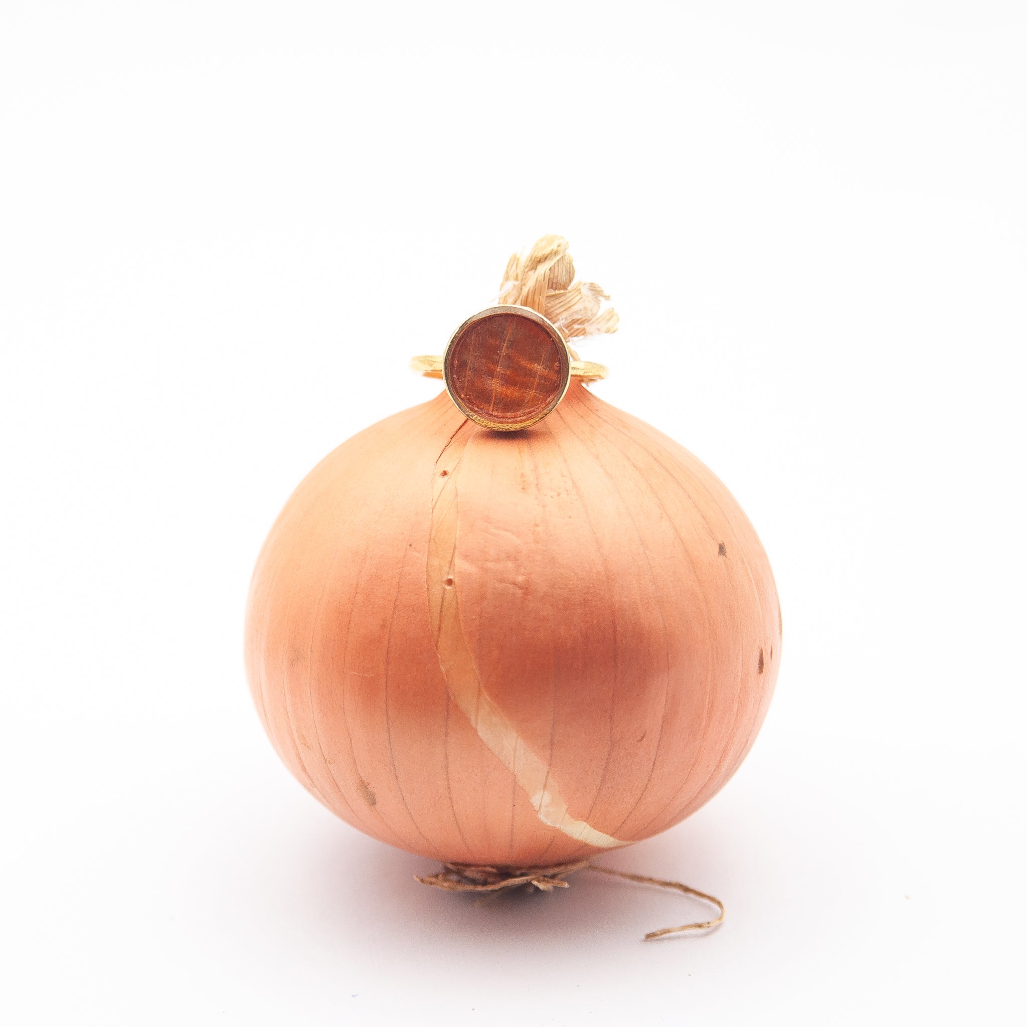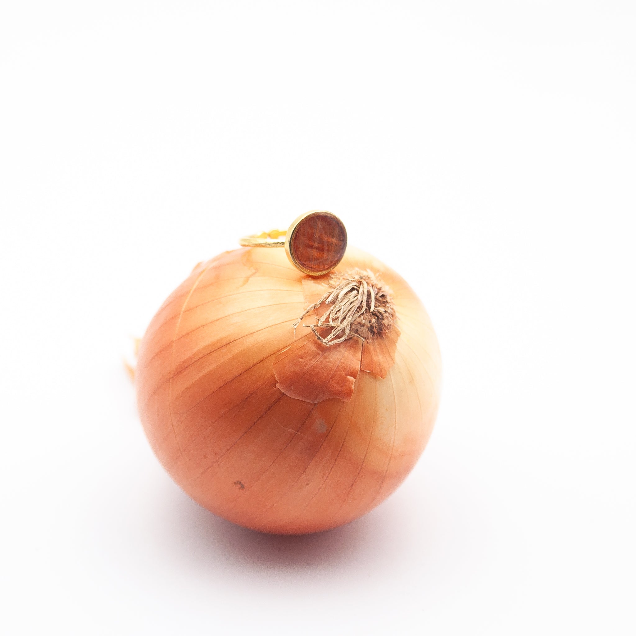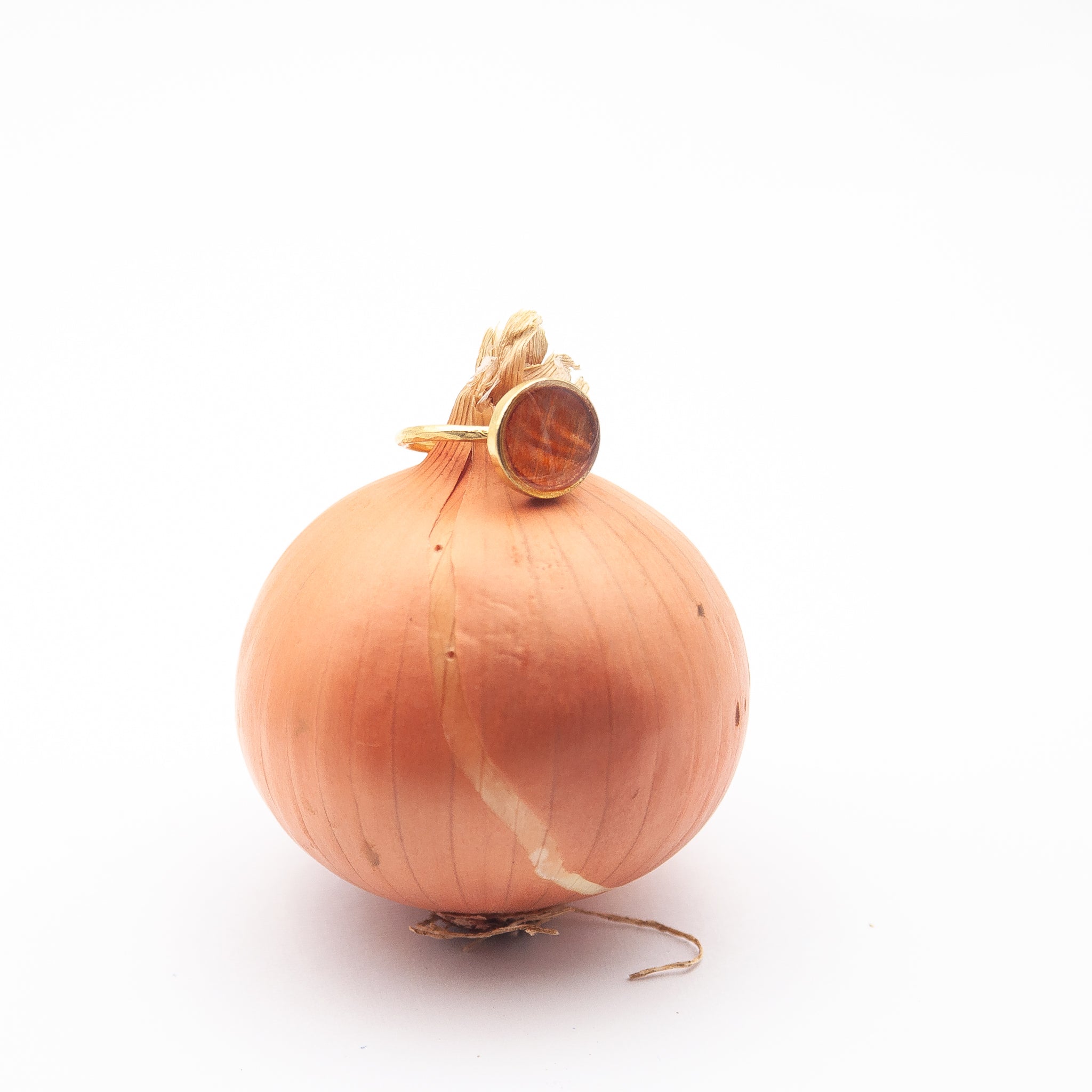 Un anello che porta con sé la poesia della cucina: vera buccia di cipolla dorata, racchiusa in un castone in ottone che ne esalta i toni caldi e luminosi. Un gioiello che trasforma un ingrediente semplice in un simbolo di bellezza inaspettata, da indossare come piccolo segreto prezioso.