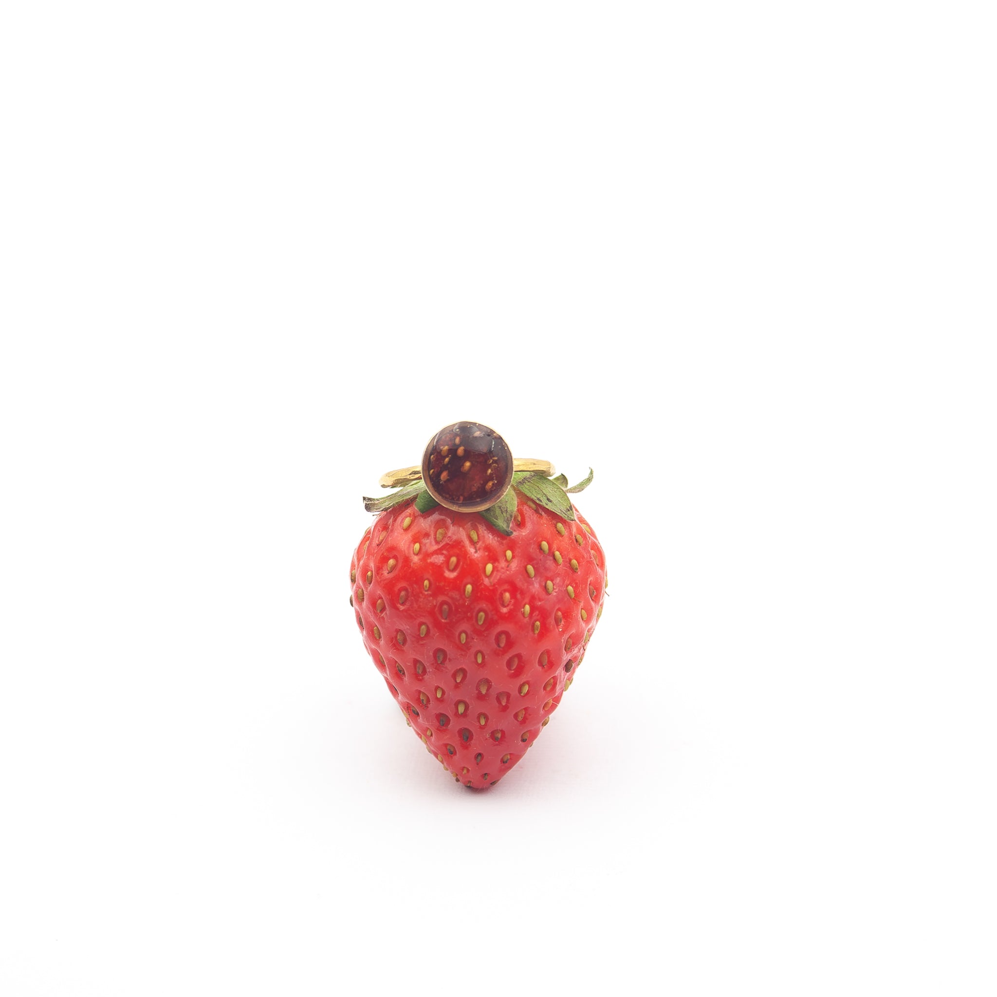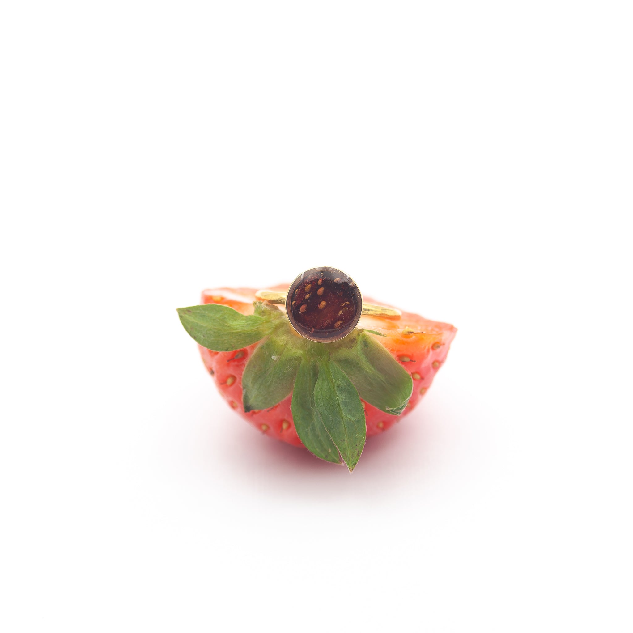 Un anello unico e raffinato, che racchiude al suo interno un frammento autentico di fragola, preservato per custodirne il colore e la vitalità. La montatura dorata mette in risalto le tonalità calde e profonde del frutto, trasformandolo in un gioiello originale e contemporaneo.