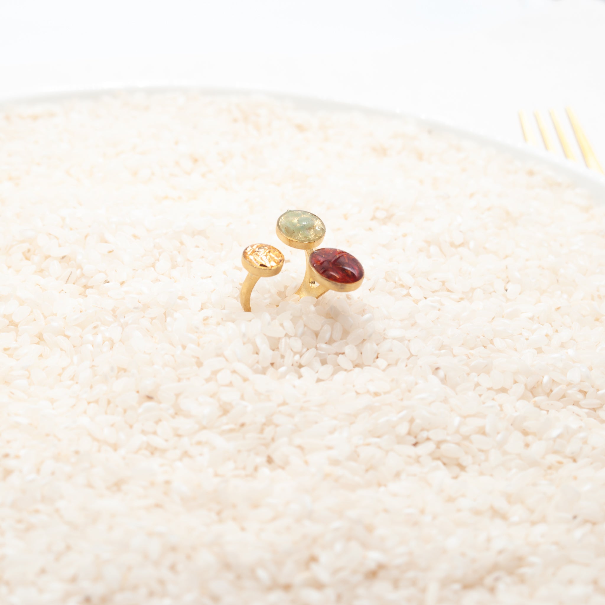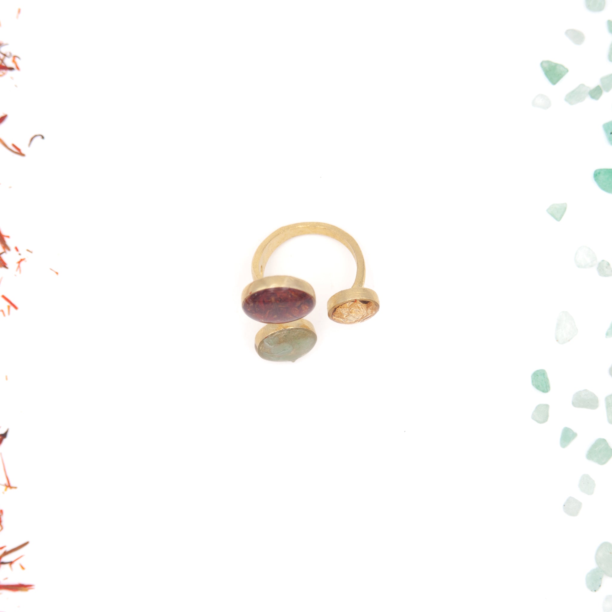 Un anello che racconta una storia di natura, luce e materia preziosa. Realizzato in ottone, è arricchito da tre elementi unici: