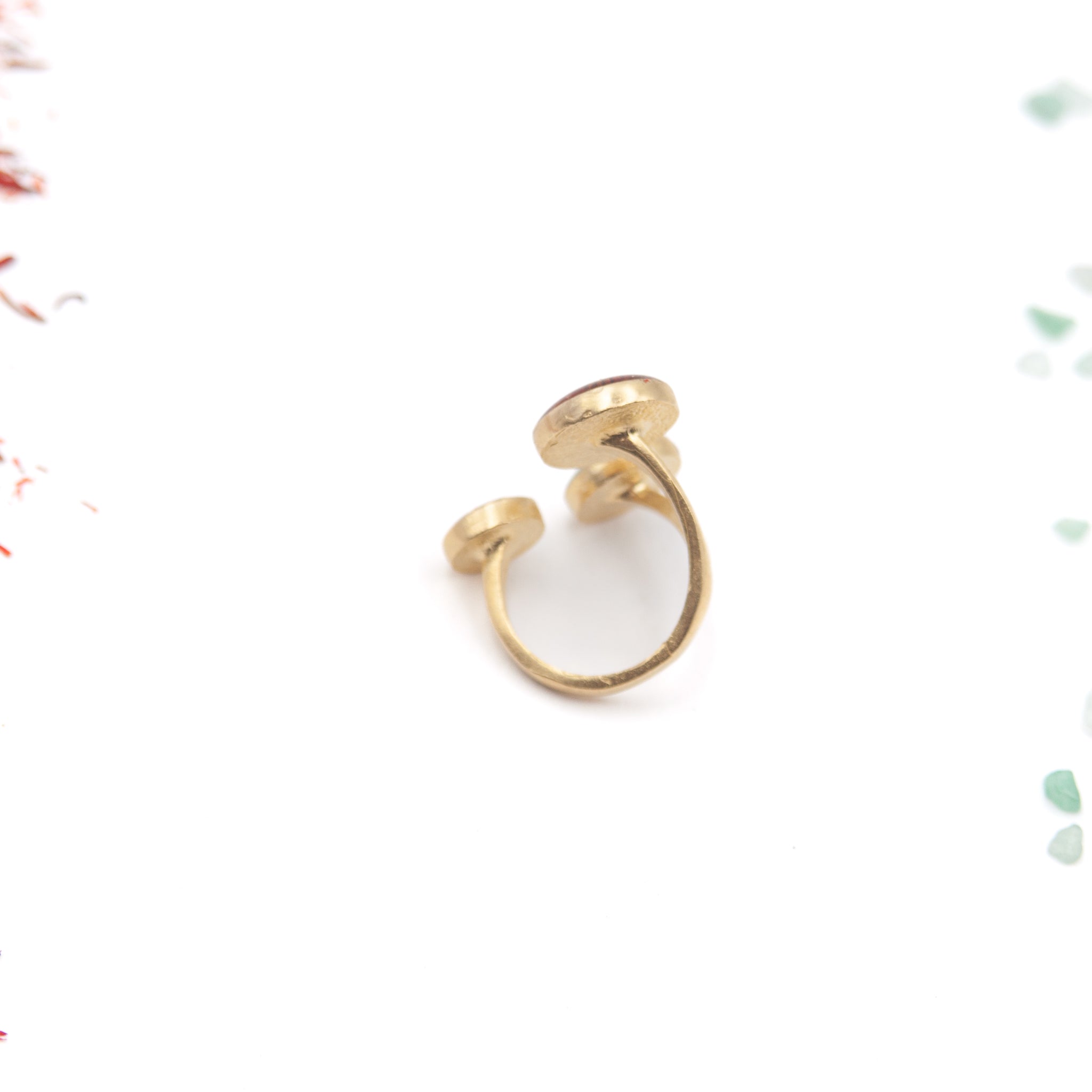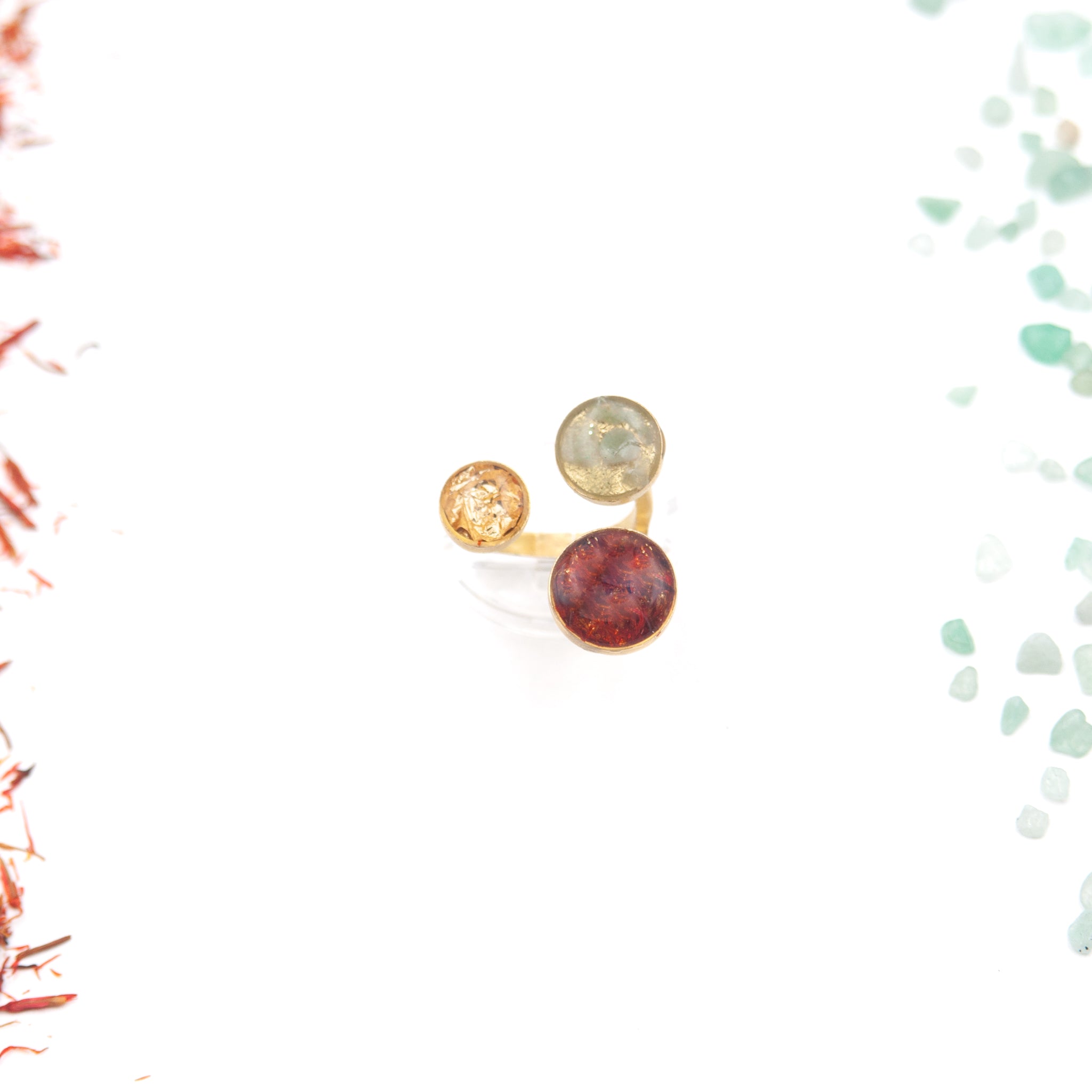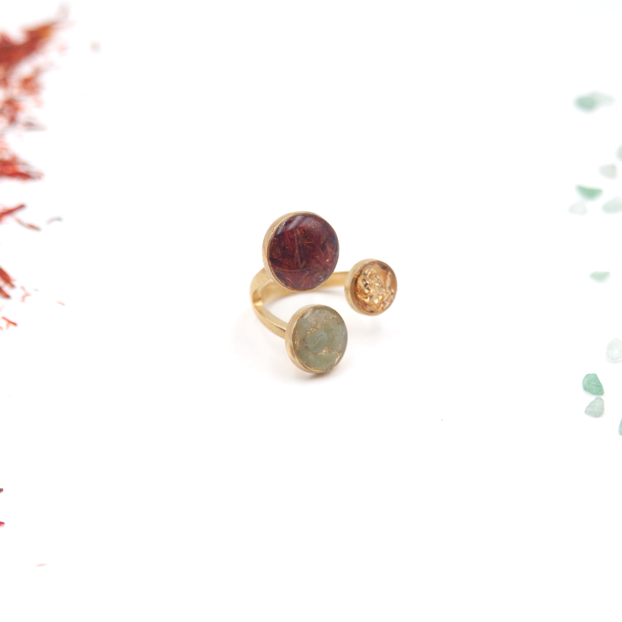 Anello aperto in ottone con zafferano, foglia dorata e avventurina
