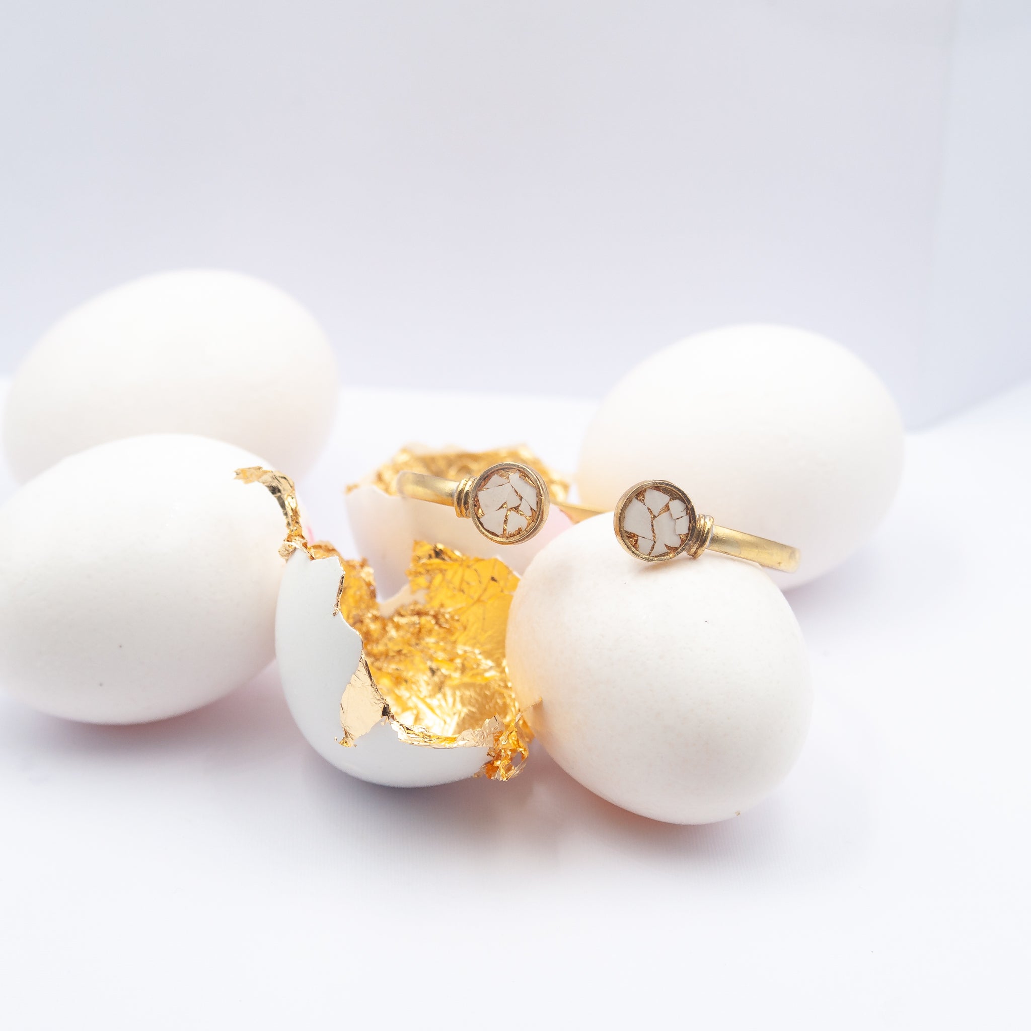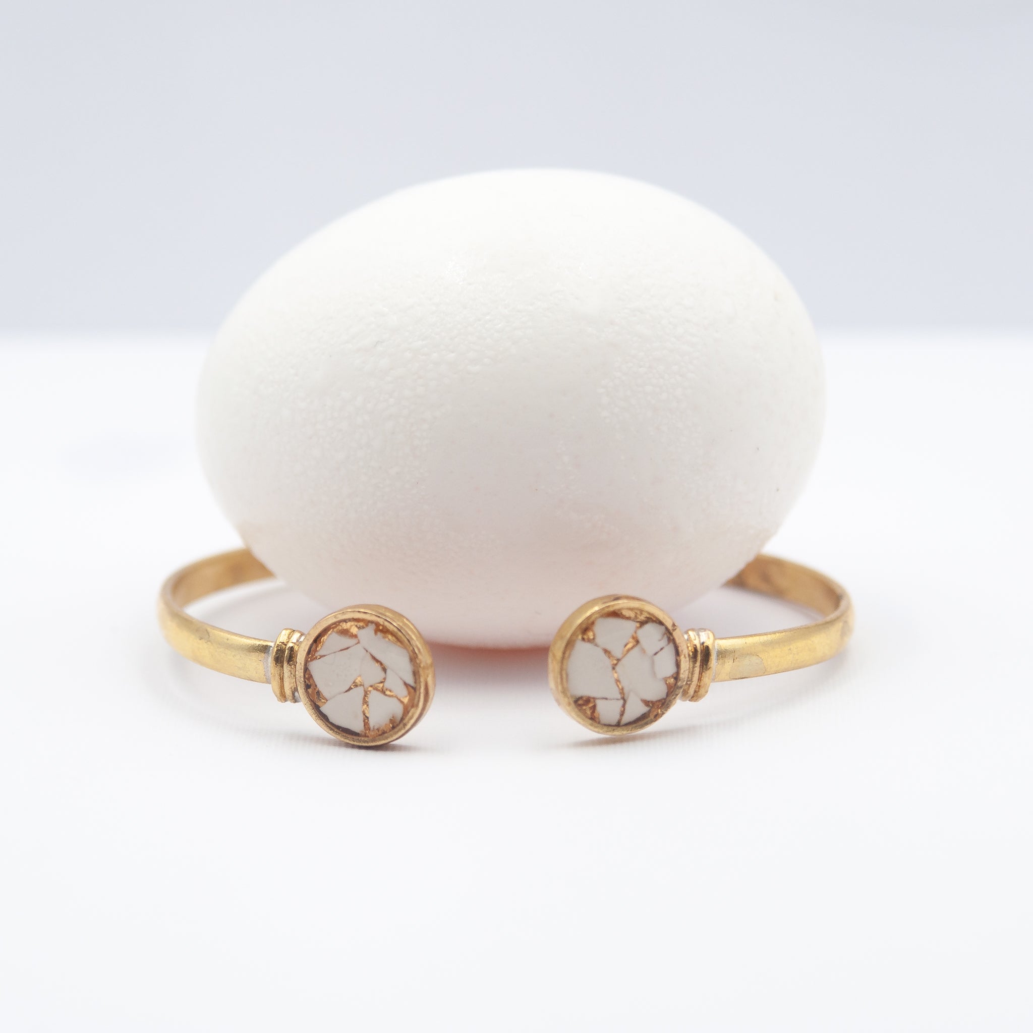 Bracciale aperto in ottone dorato, realizzato con frammenti di guscio d’uovo e foglia dorata. Un design essenziale ma raffinato, che esalta la delicatezza della materia fragile trasformandola in un gioiello dal carattere unico.