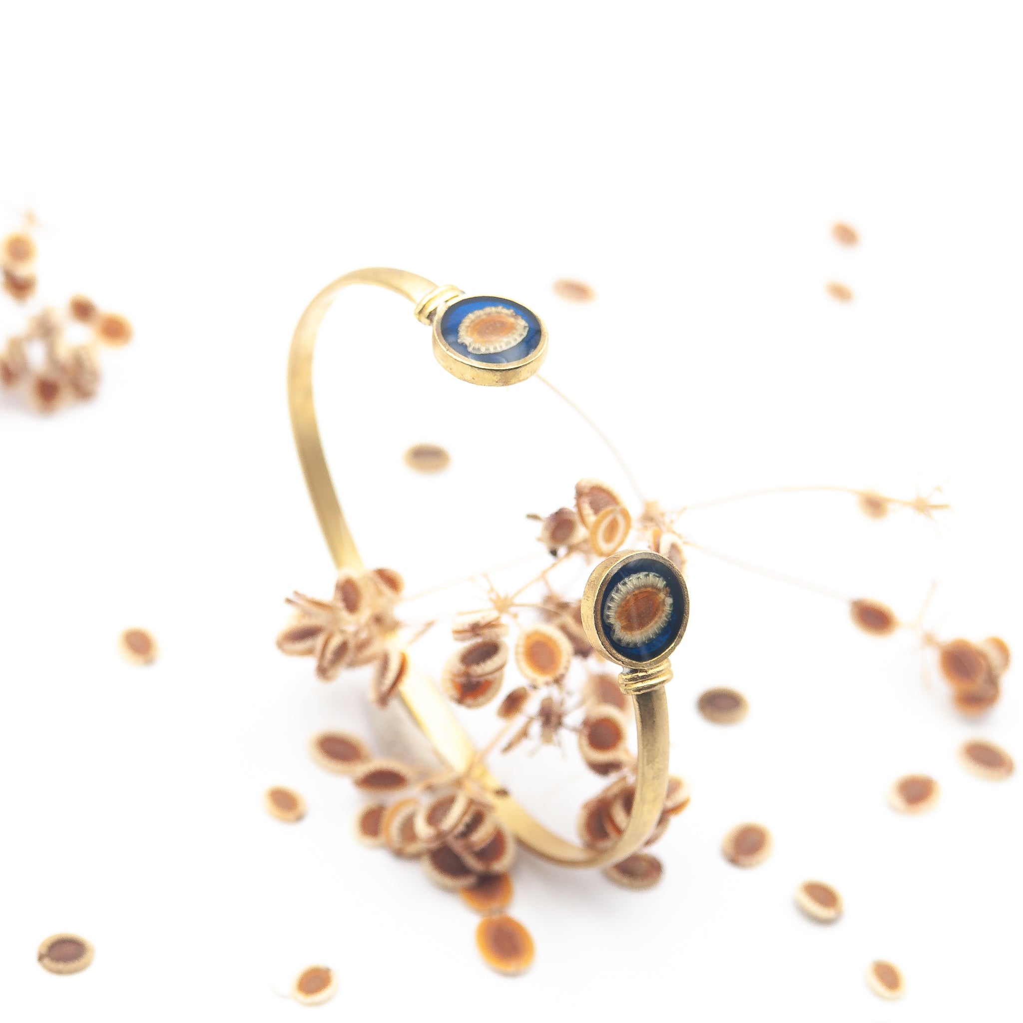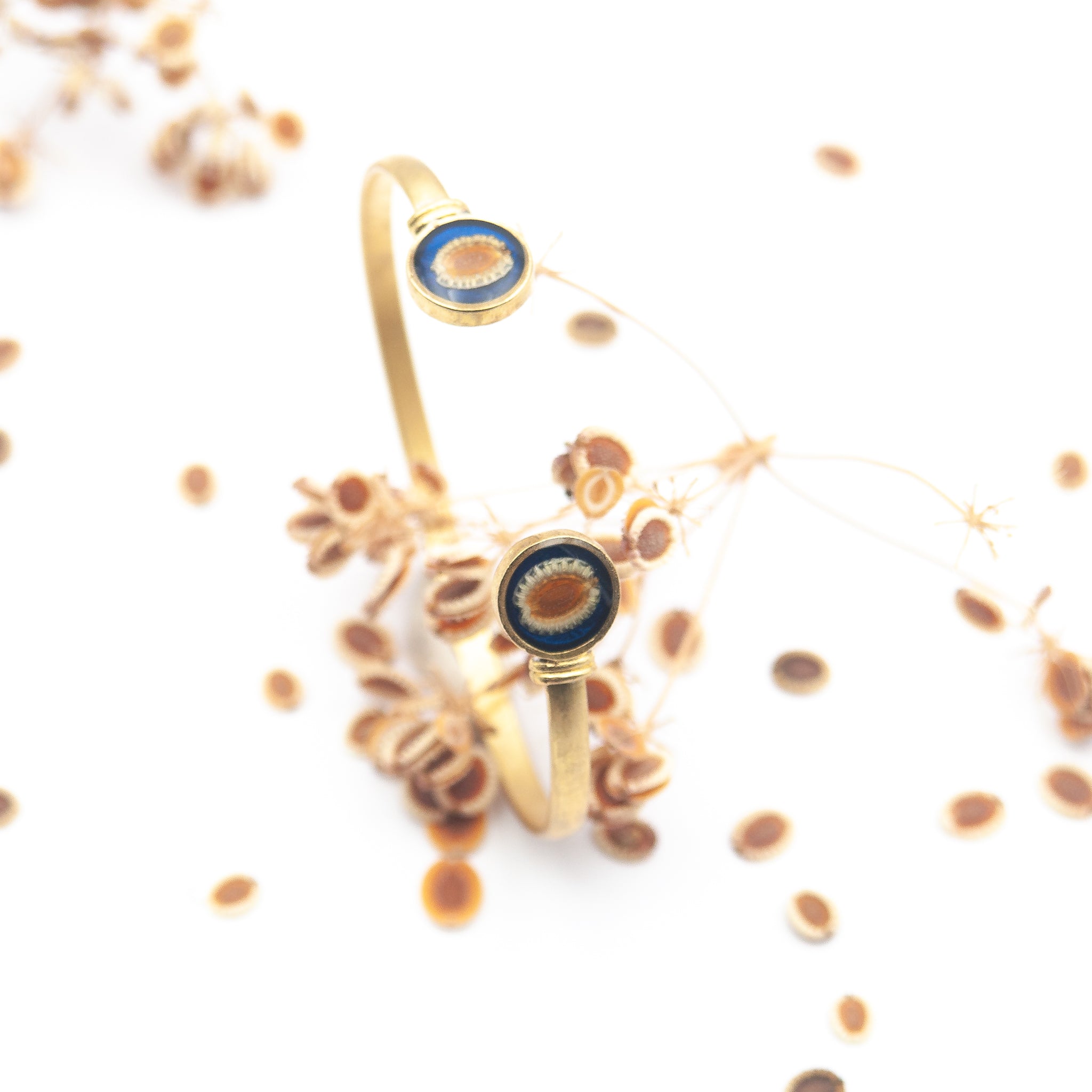 Un bracciale artigianale dal design essenziale che racchiude al suo interno i semi di ombrellino pugliese, custoditi in resina con uno sfondo blu metallico che ne esalta le forme naturali. La struttura dorata, sottile ed elegante, abbraccia il polso con leggerezza, trasformando un elemento semplice della natura in un dettaglio prezioso e contemporaneo.