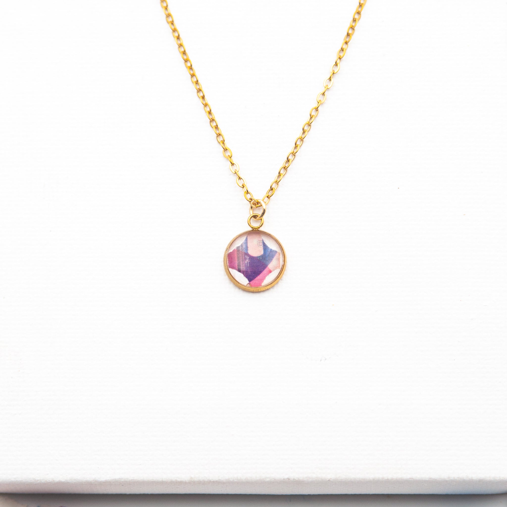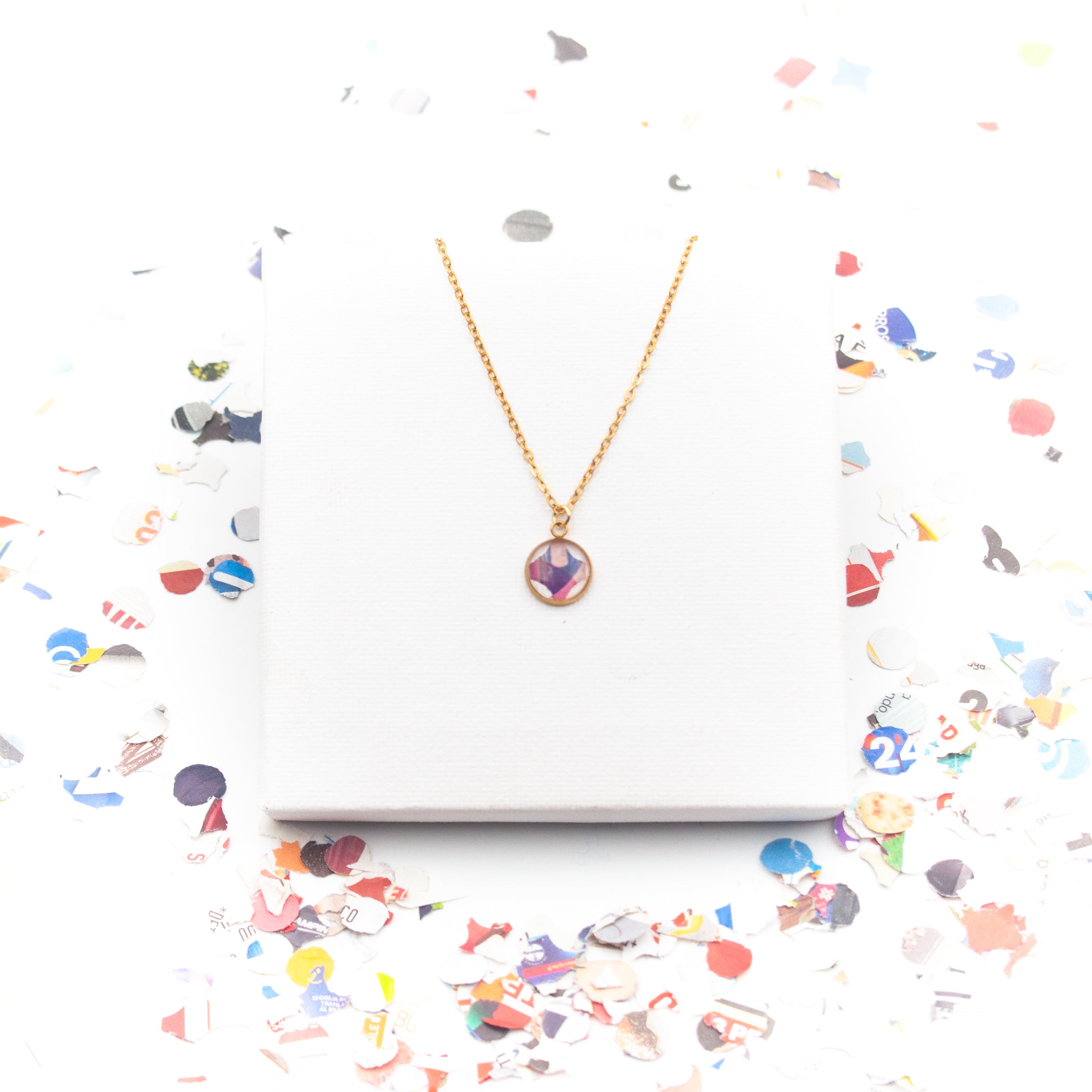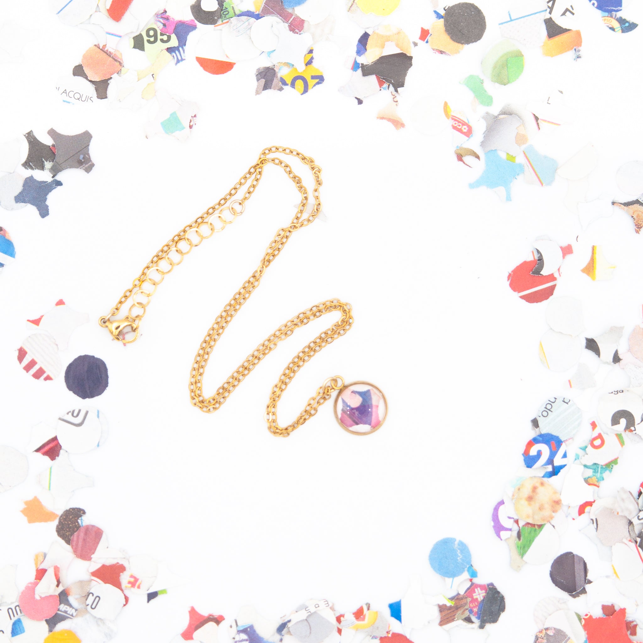 Collana con pendente che racchiude un coriandolo ritagliato da volantini di supermercati e inglobato nella resina. Colori, lettere e frammenti grafici si incontrano in una composizione unica, guidata dal caso.