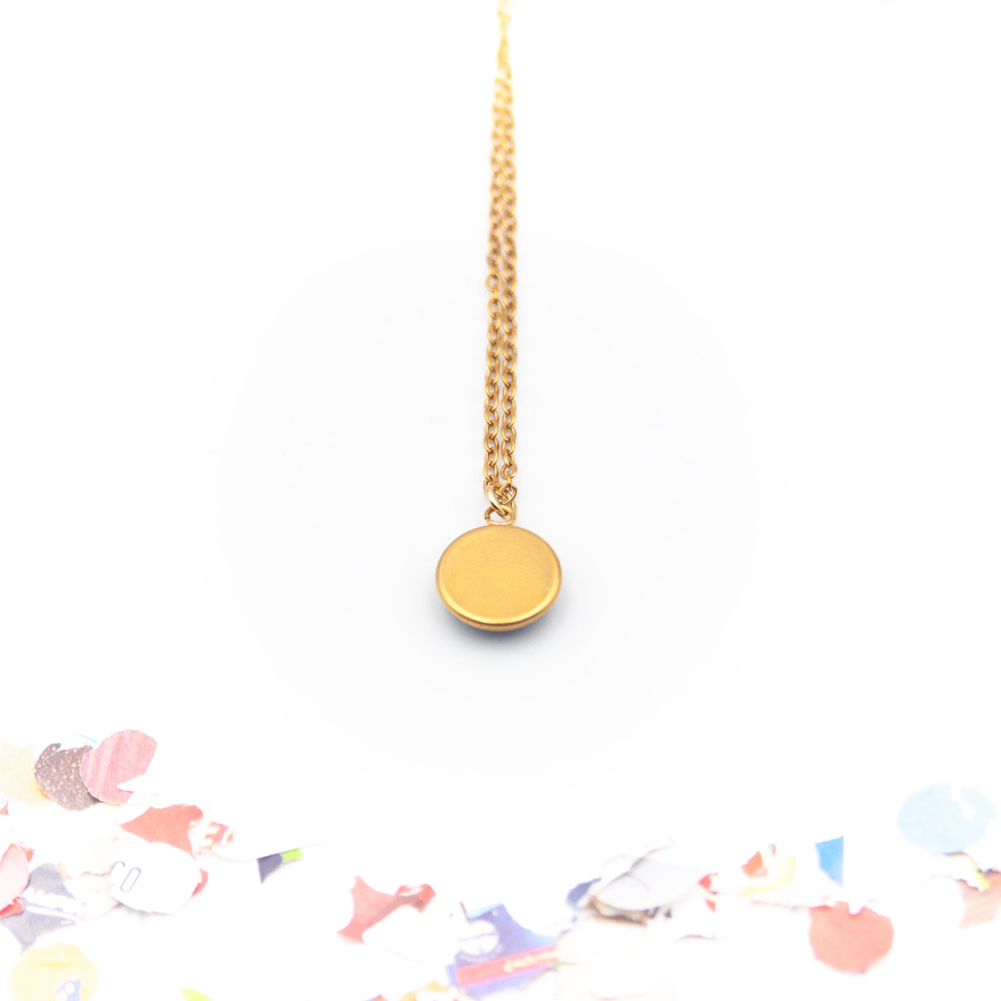 Materiali: resina da belle arti, coriandolo – Metallo catena: acciaio dorato anallergico