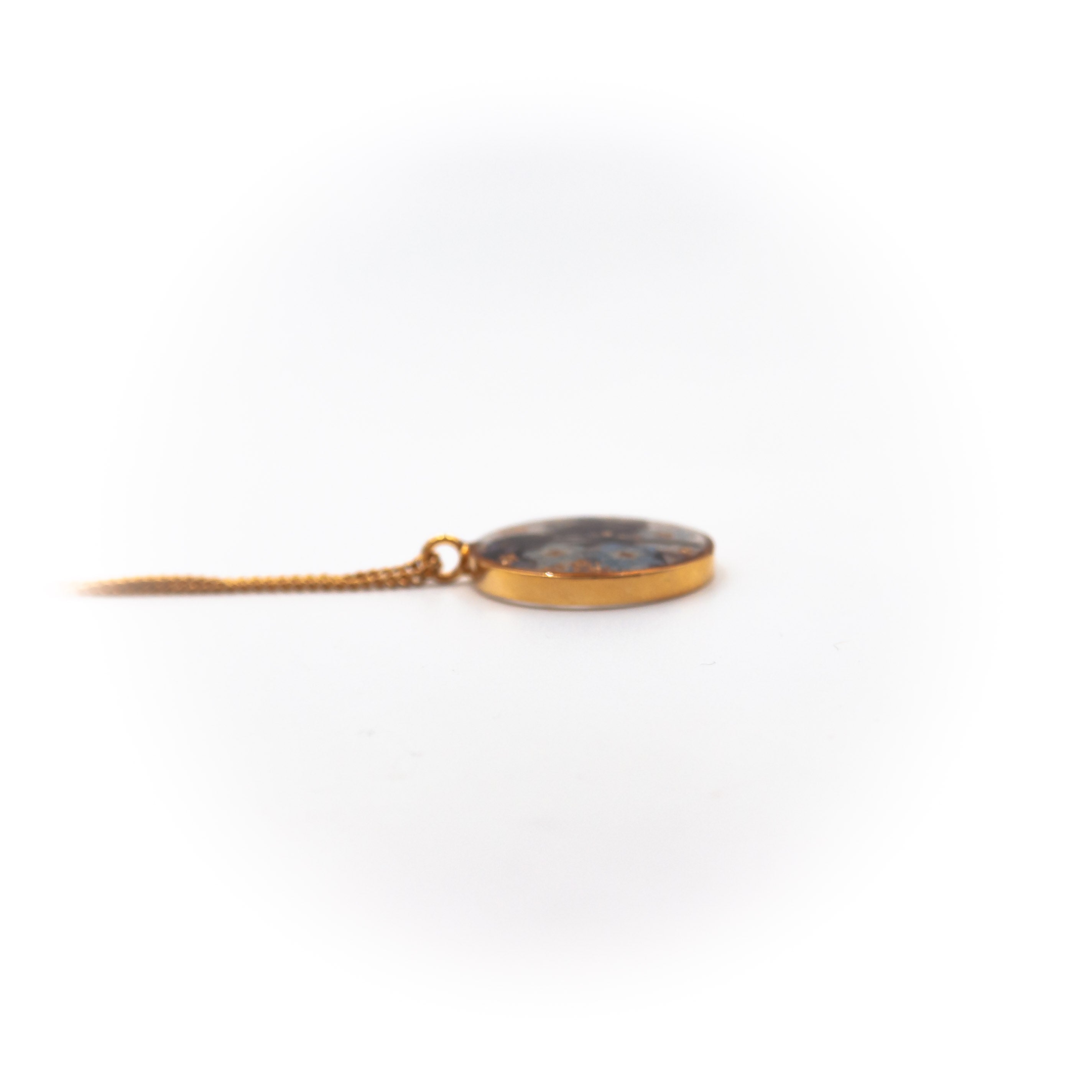 Un gioiello che custodisce la delicatezza della natura e il significato profondo dei ricordi. Il ciondolo in ottone bagnato in oro è riempito di resina trasparente che racchiude veri fiori di non ti scordar di me, arricchiti da frammenti dorati.