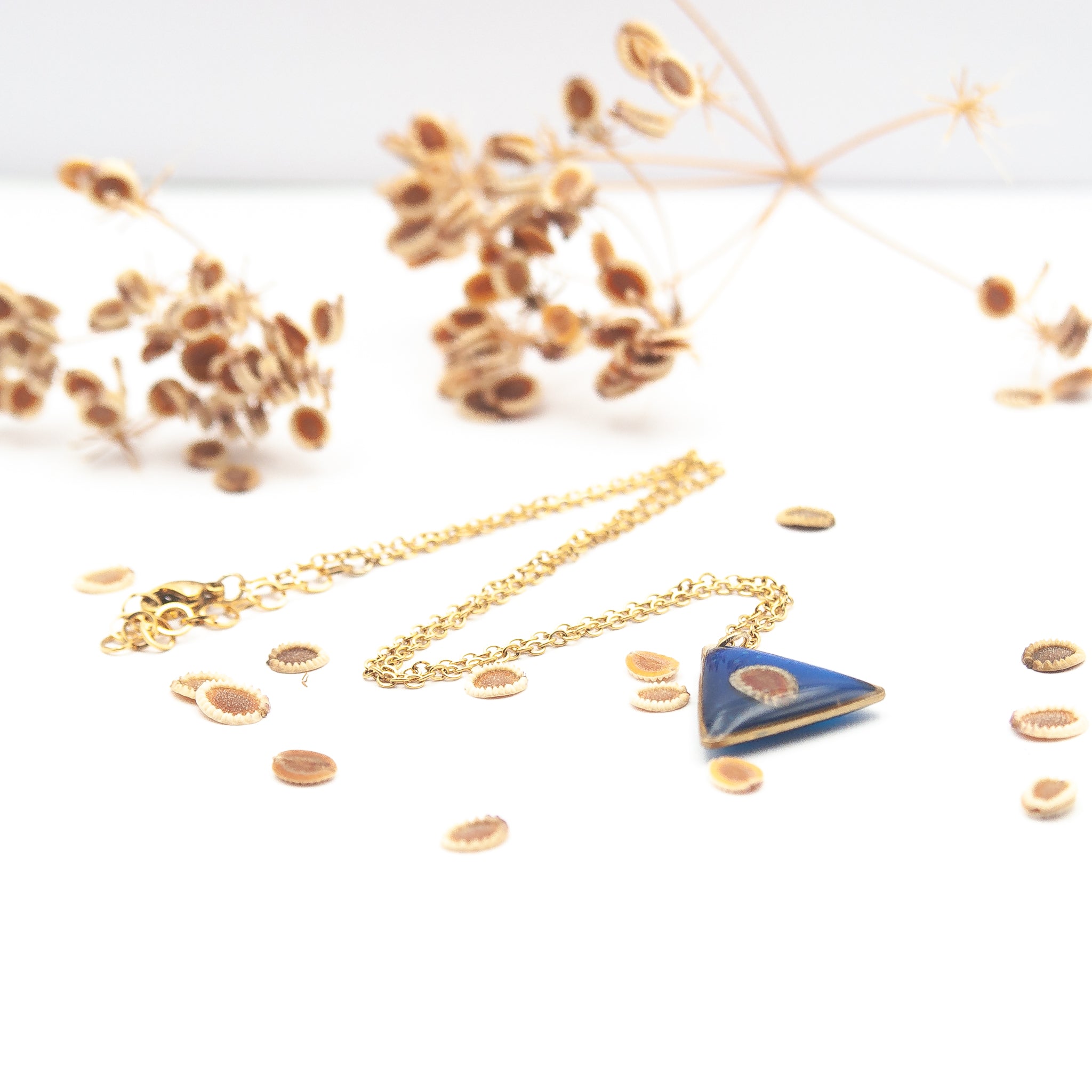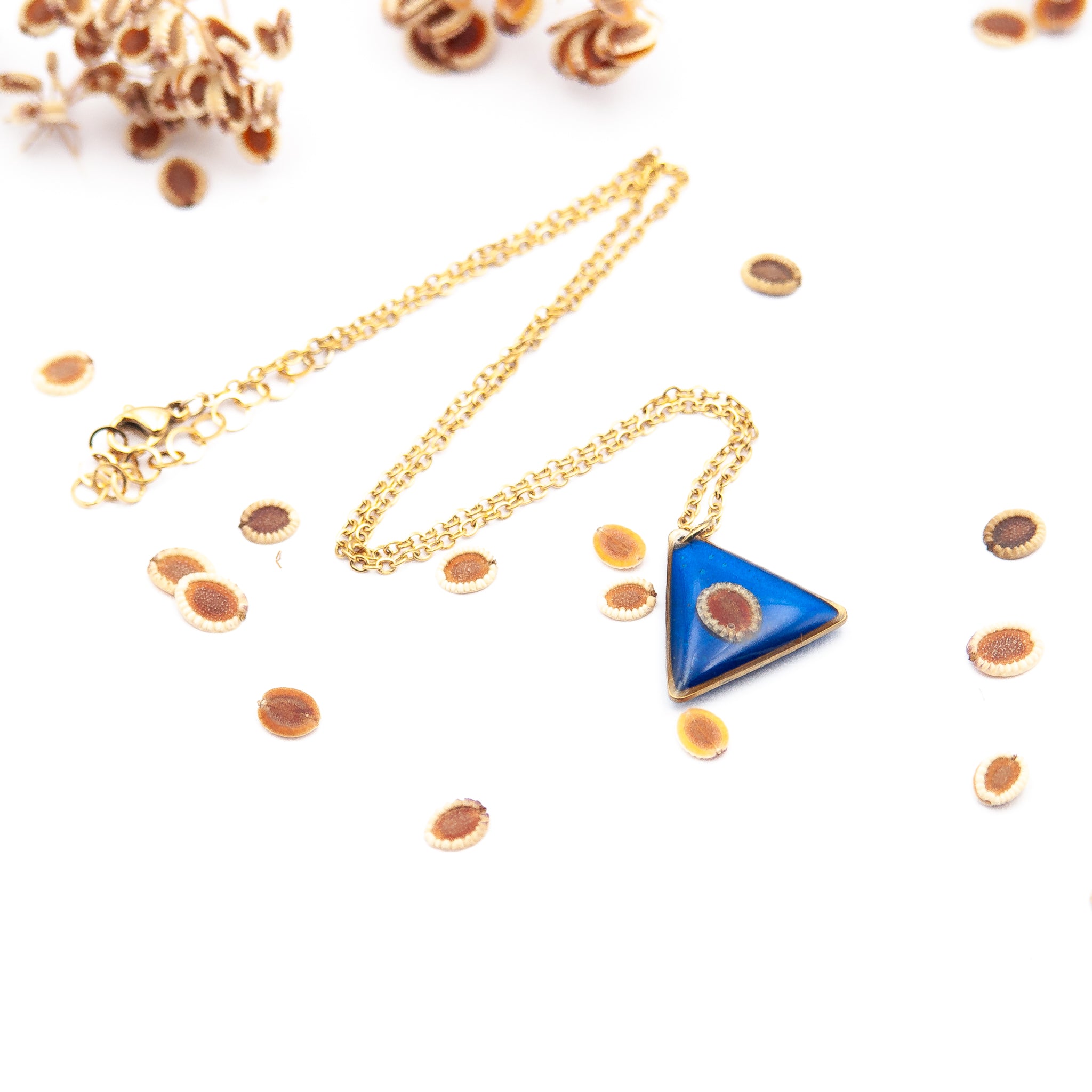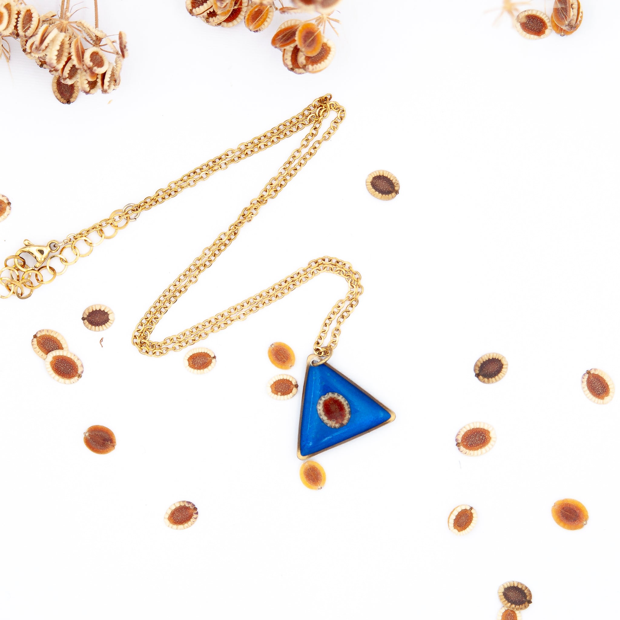 Questa collana racchiude un seme di ombrellino pugliese, pianta spontanea che sorprende per le sue forme naturali ed essenziali. Il seme è incastonato in una montatura dorata e poggia su uno sfondo blu metallico, luminoso e vibrante, che ne valorizza i dettagli e crea un raffinato gioco di contrasti. Un gioiello che unisce semplicità ed eleganza, rendendo ogni pezzo unico come la natura che lo ispira.