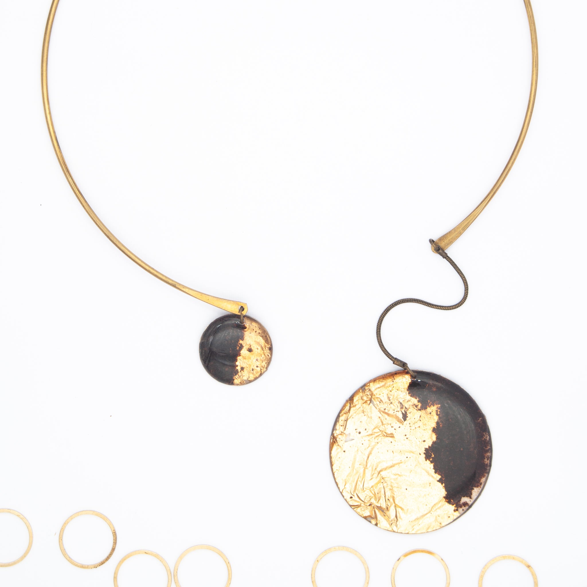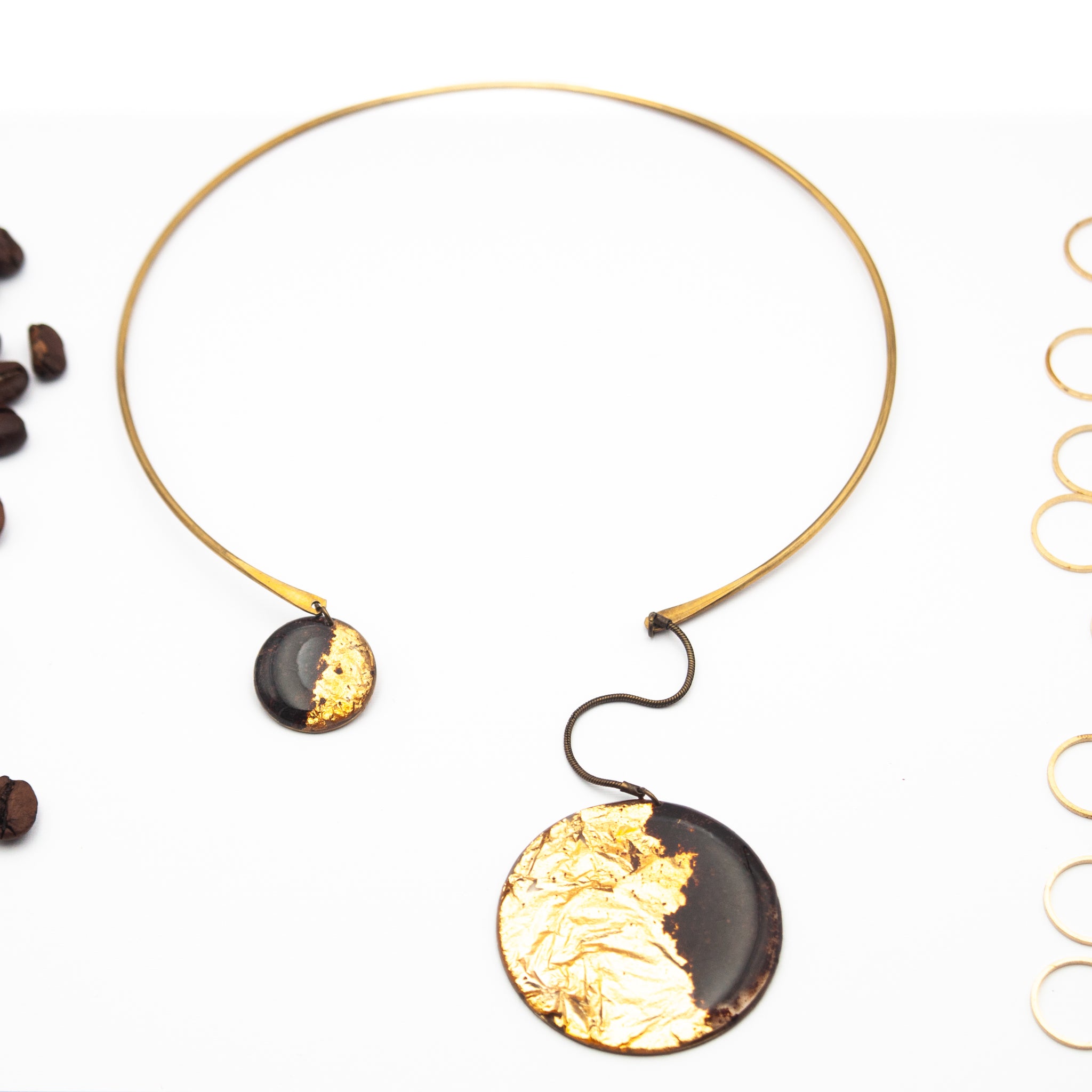 Diametro ciondoli: 2 e 4,5 cm –  Diametro girocollo: 13 cm circa - Materiali: resina da belle arti, polvere di caffè e foglia dorata – Metallo: girocollo in ottone anticato