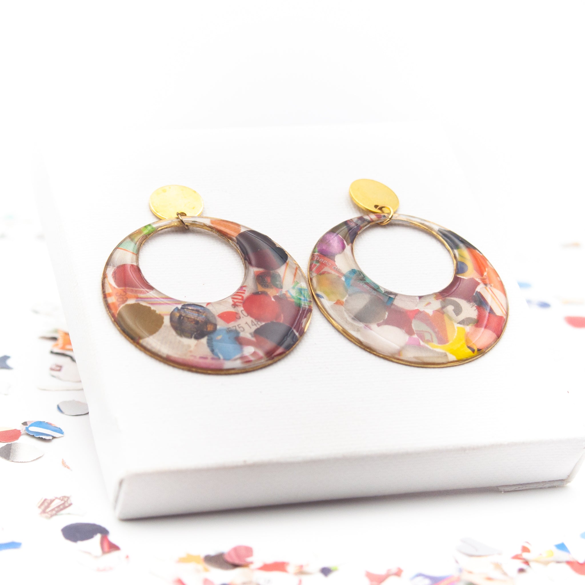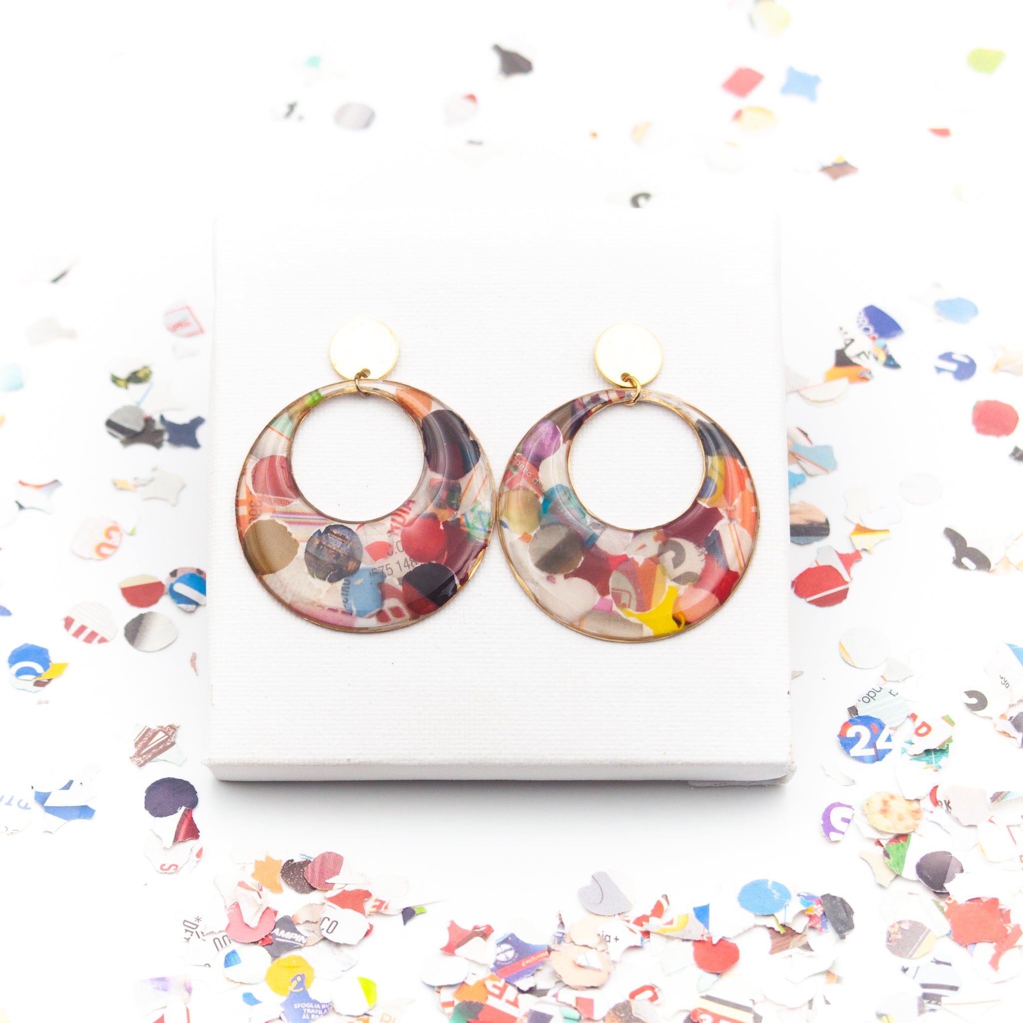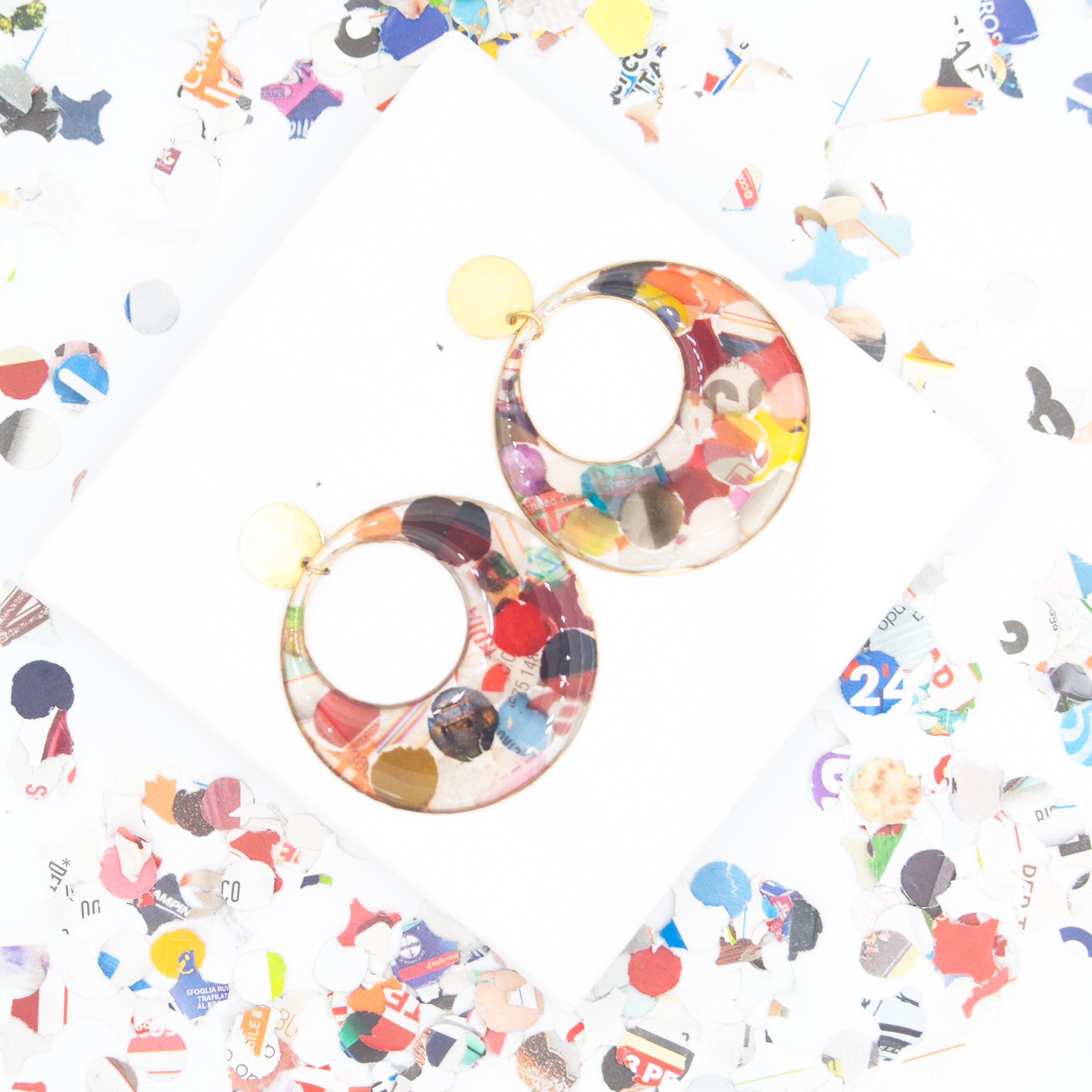 Questi orecchini a cerchio nascono da un gesto semplice e stagionale: i coriandoli di Carnevale, ritagliati da volantini dei supermercati, vengono inglobati nella resina e trasformati in una superficie vibrante, irregolare, sorprendentemente elegante.