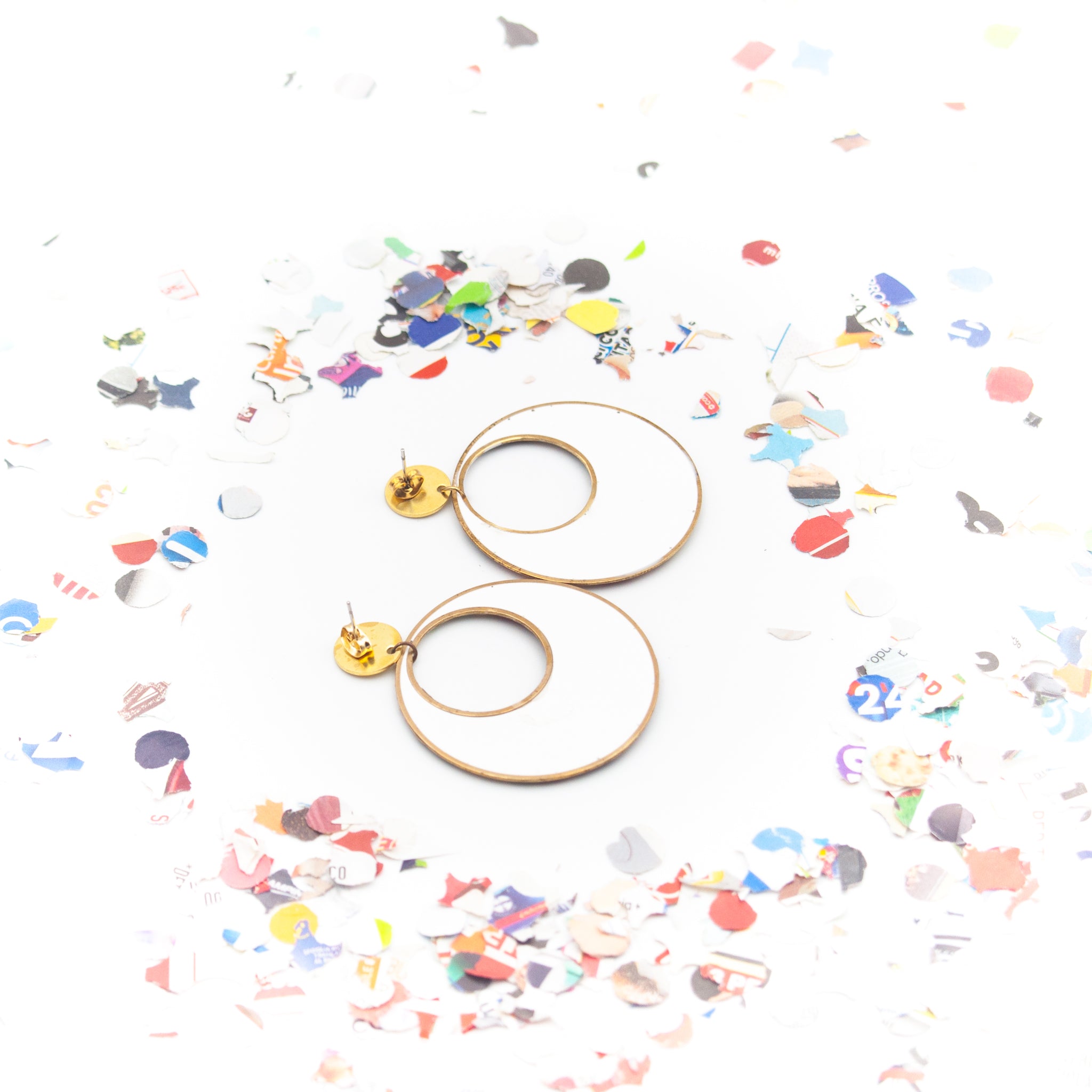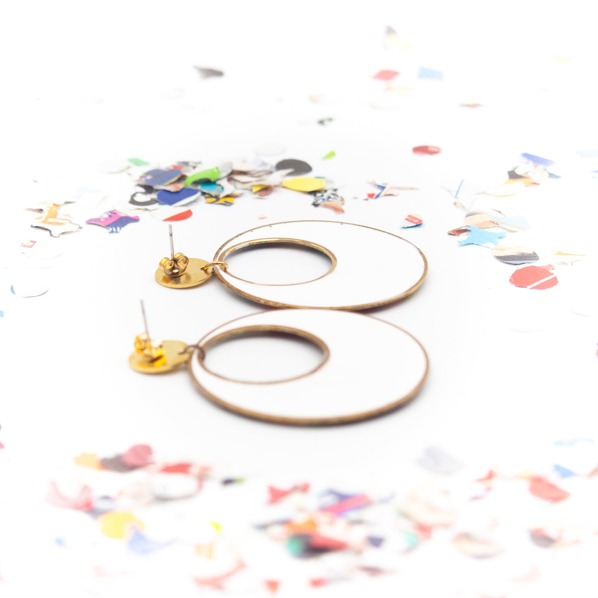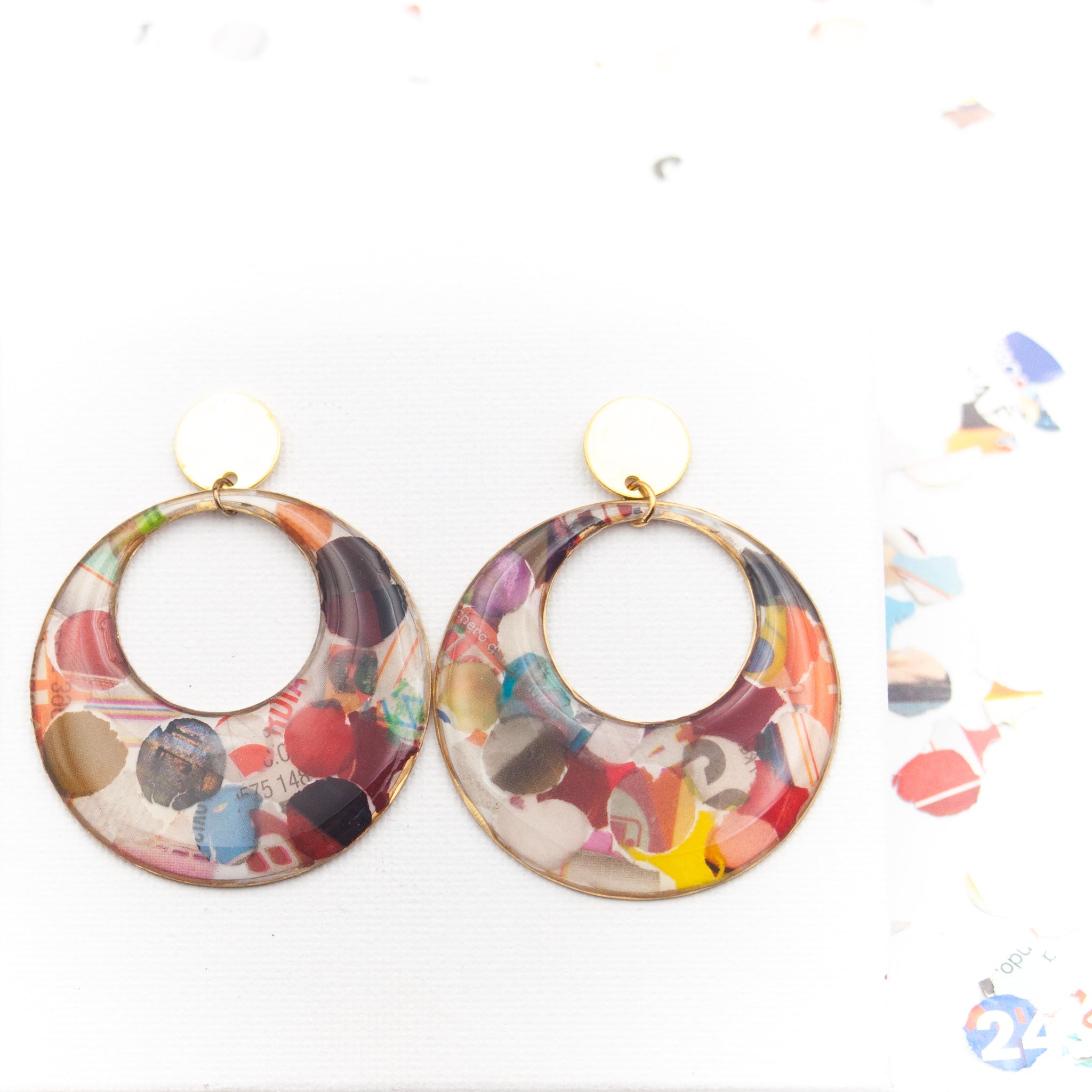 Questi orecchini a cerchio nascono da un gesto semplice e stagionale: i coriandoli di Carnevale, ritagliati da volantini dei supermercati, vengono inglobati nella resina e trasformati in una superficie vibrante, irregolare, sorprendentemente elegante.