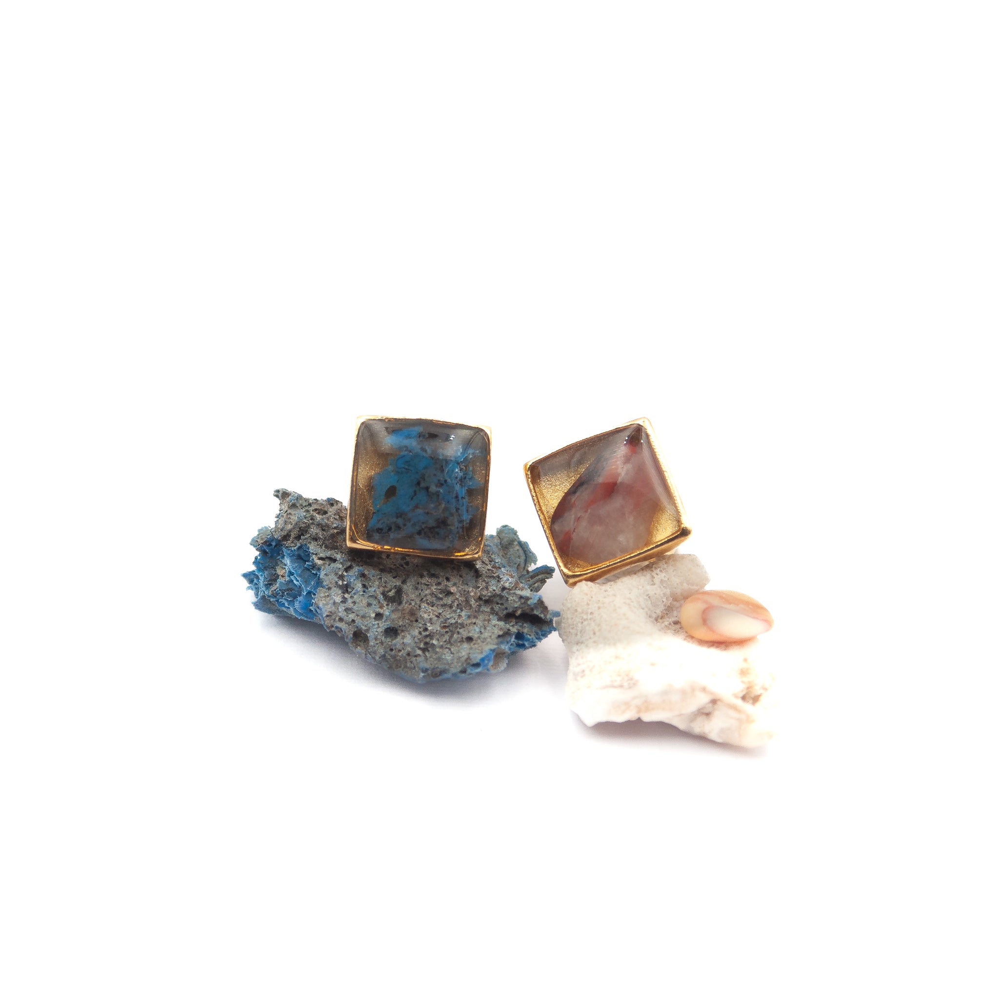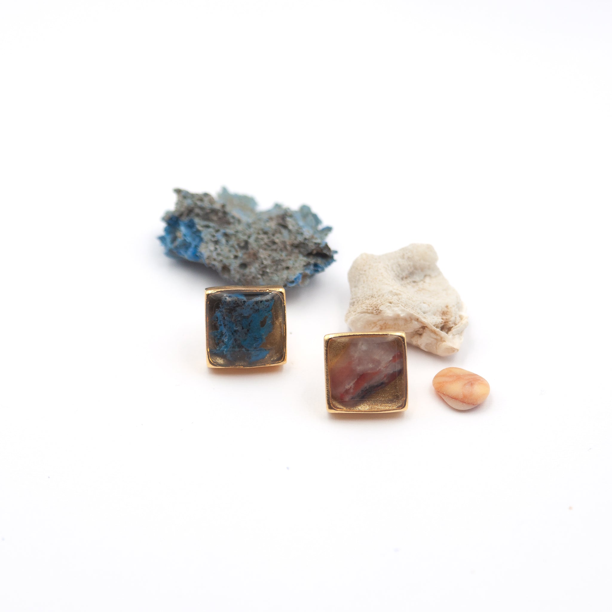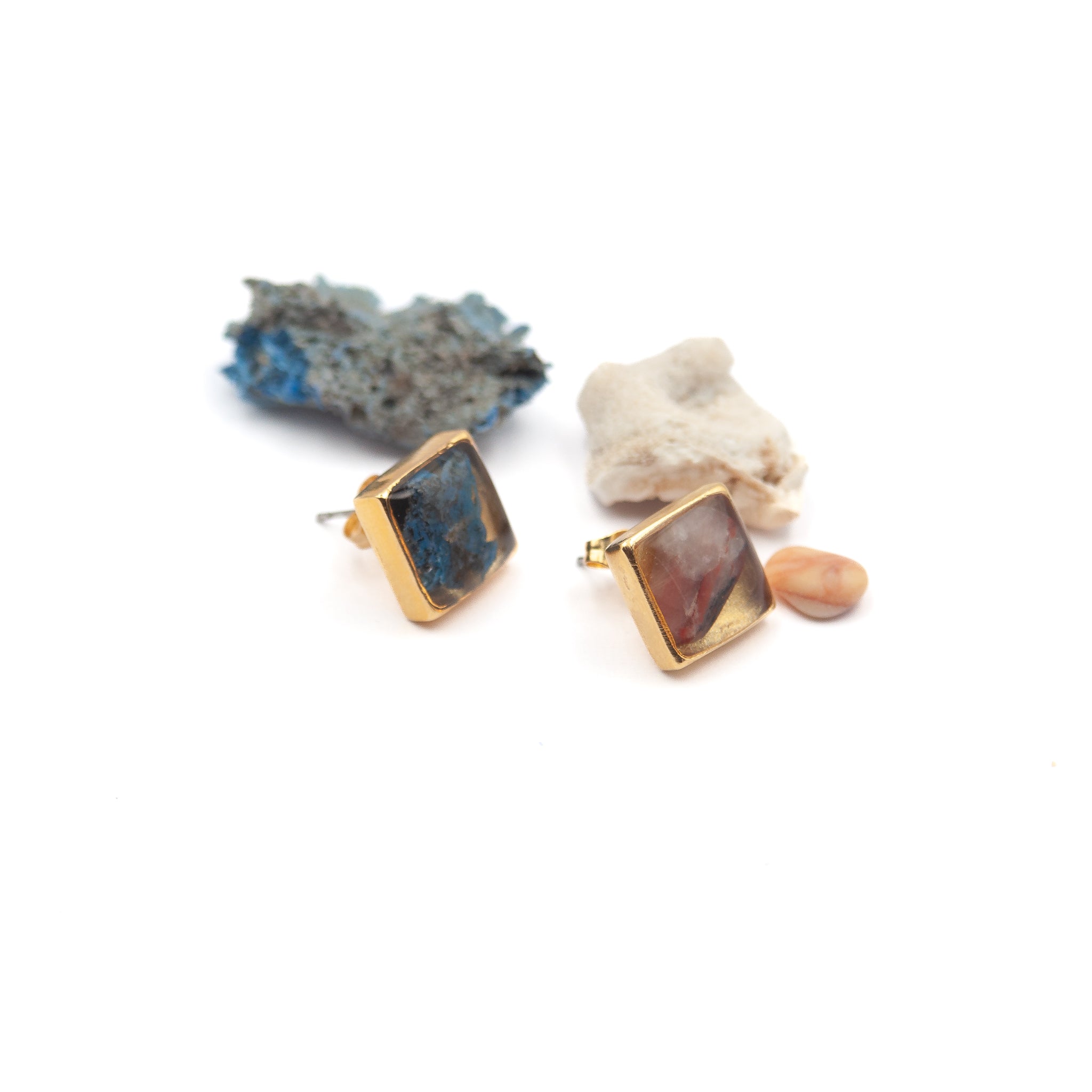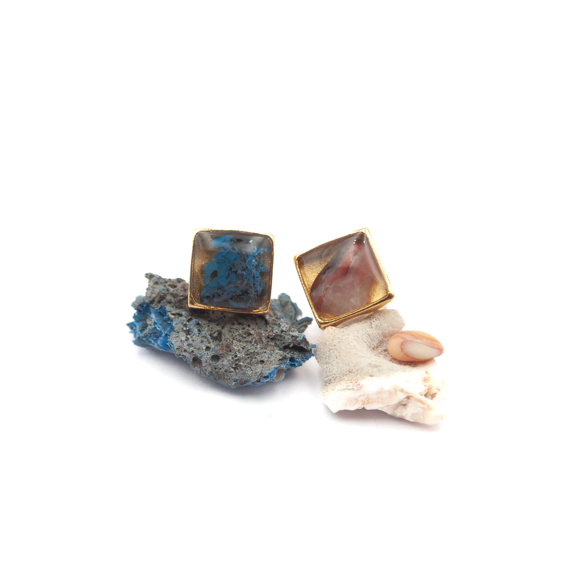 Un incontro inatteso tra naturale e artificiale prende forma in questi orecchini. All’interno delle montature in ottone, la trasparenza della resina racchiude un frammento di plastica blu e un sasso levigato dal mare, due elementi agli antipodi che il tempo e le onde hanno fatto convivere.