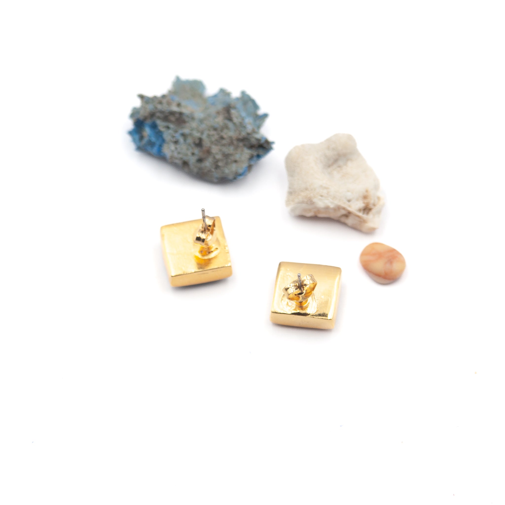 Lato: 1,2 cm -Materiali: conchiglia e spugna – Metallo: perno e farfalla in acciaio inossidabile, quadrato in ottone bagnato oro 18k