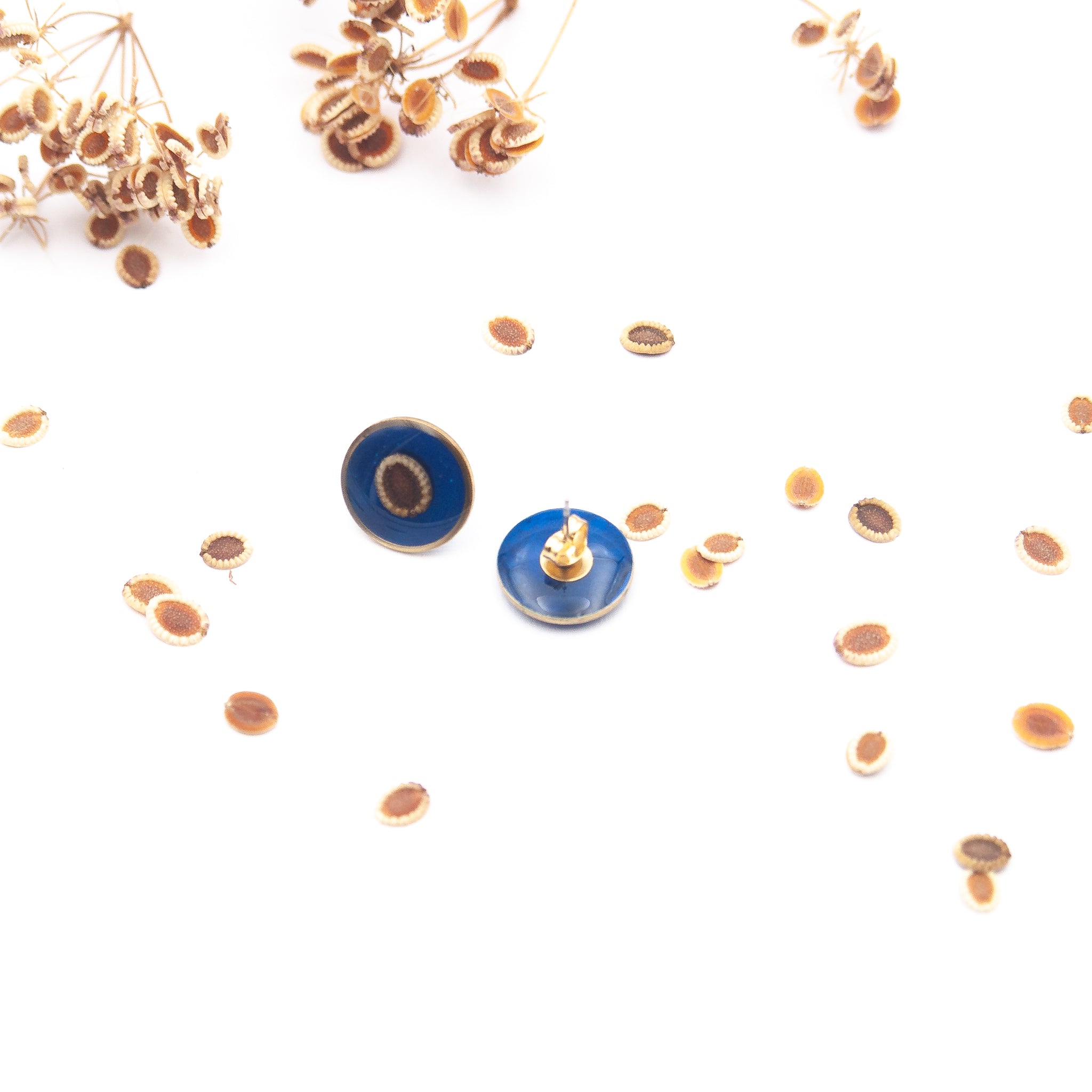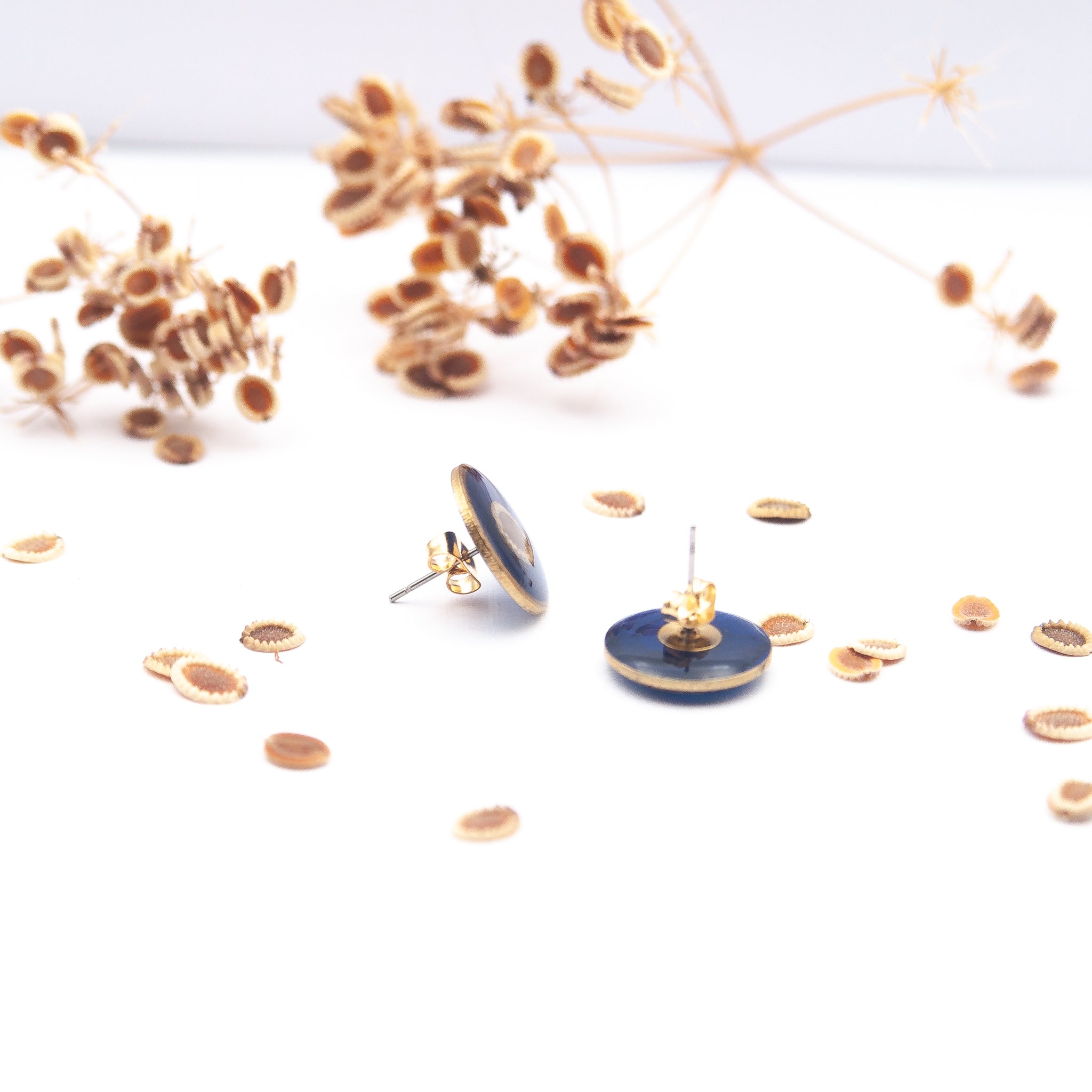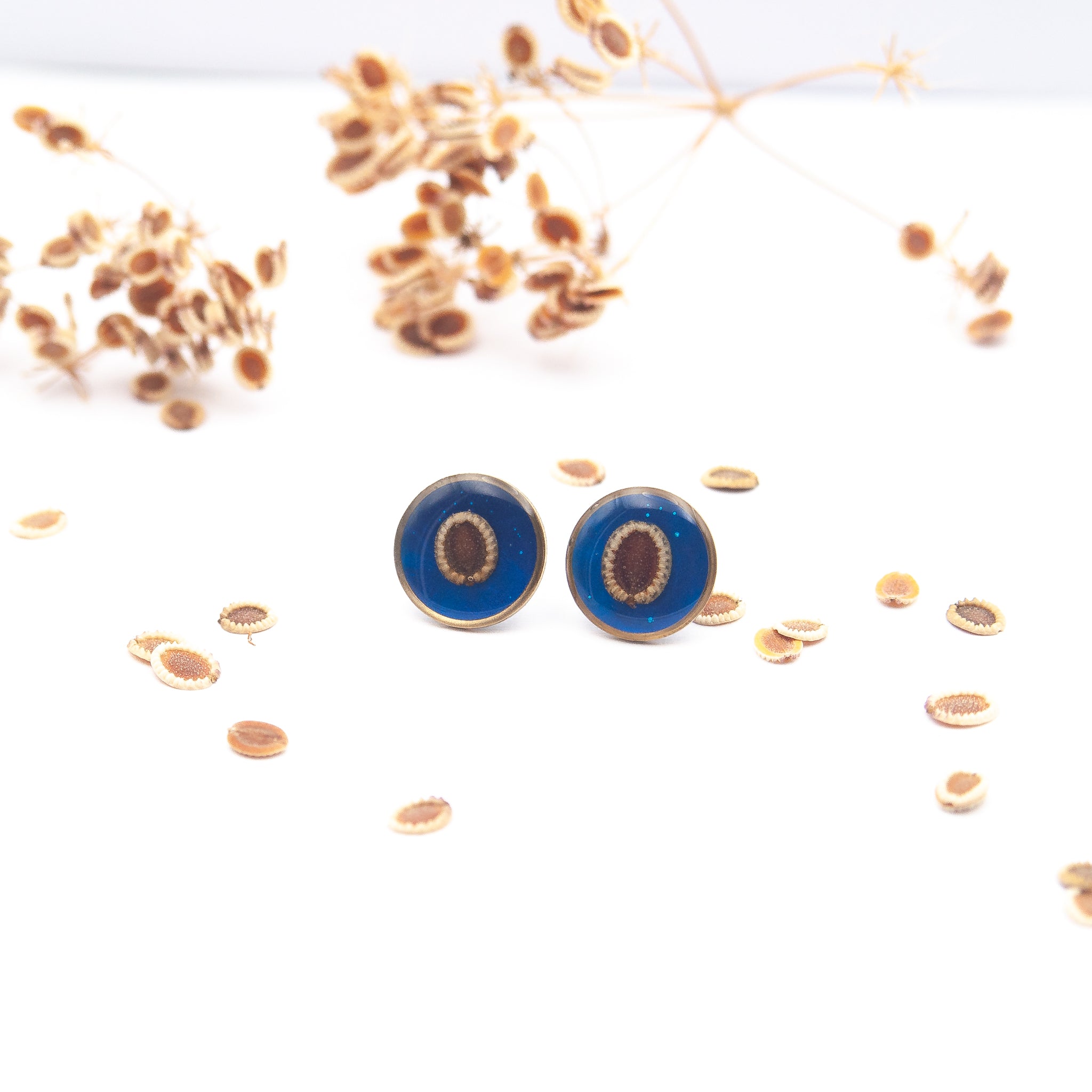 Questi orecchini racchiudono i semi di ombrellino pugliese, una pianta spontanea che sorprende per la sua forma elegante e geometrica. I semi, con il loro disegno naturale che ricorda un piccolo occhio, risaltano su uno sfondo blu intenso, creando un contrasto raffinato e suggestivo. Un gioiello dal design essenziale, che celebra la forza e la semplicità della natura.