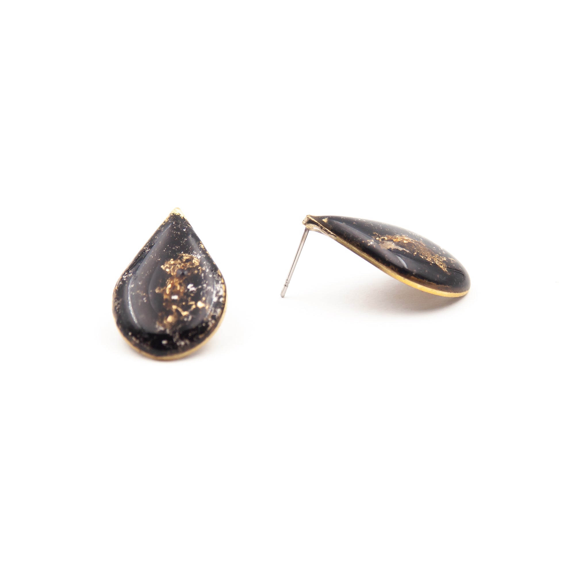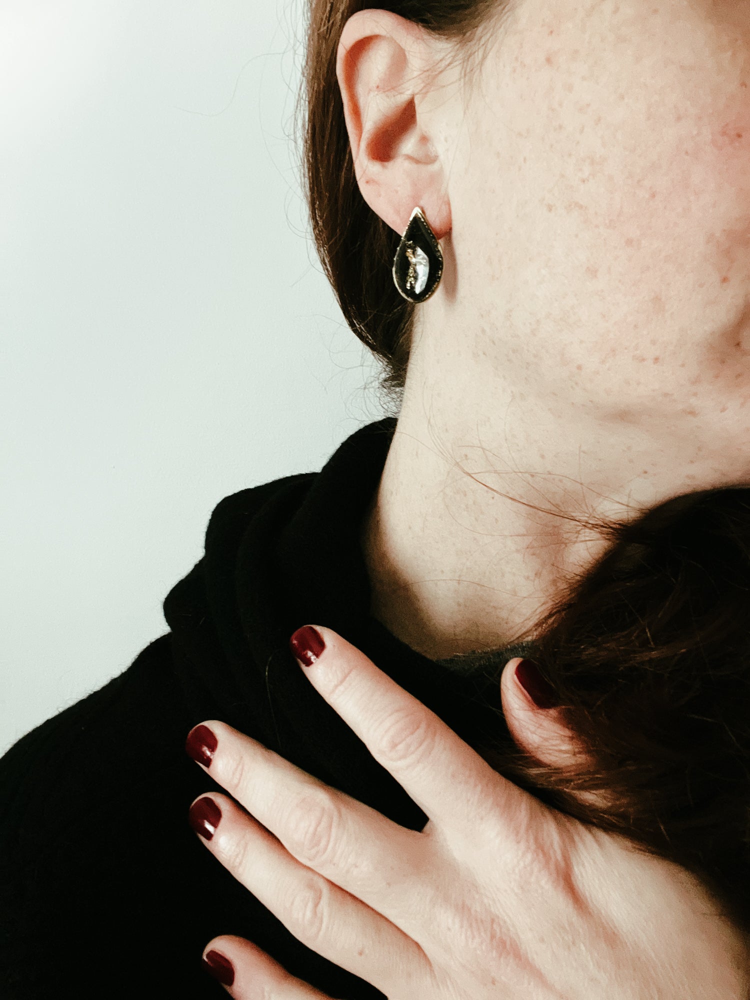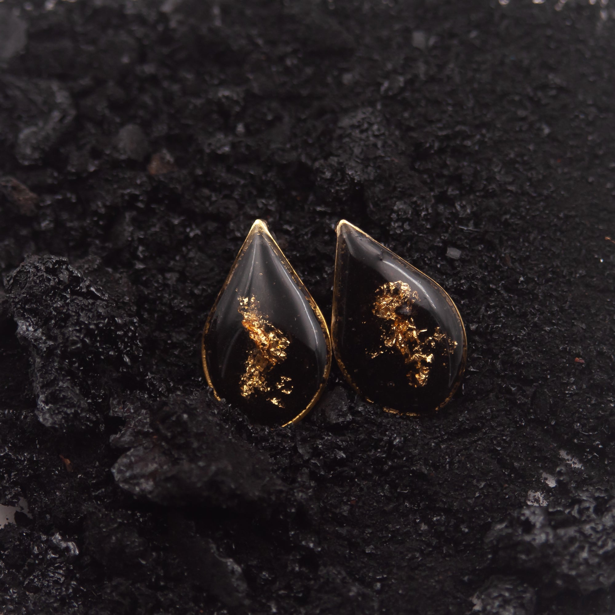 Un paio di orecchini dal carattere intenso, dove il buio incontra la luce. L’ottone incornicia due gocce in resina trasparente che racchiudono fuliggine nera e frammenti di foglia dorata, creando riflessi unici e irripetibili.