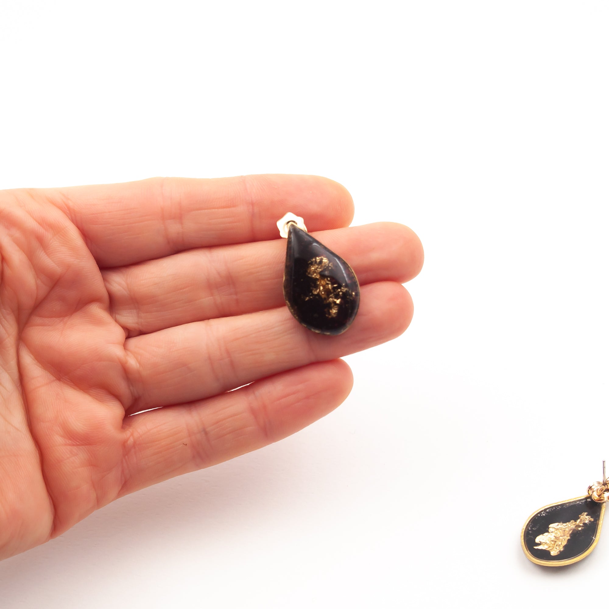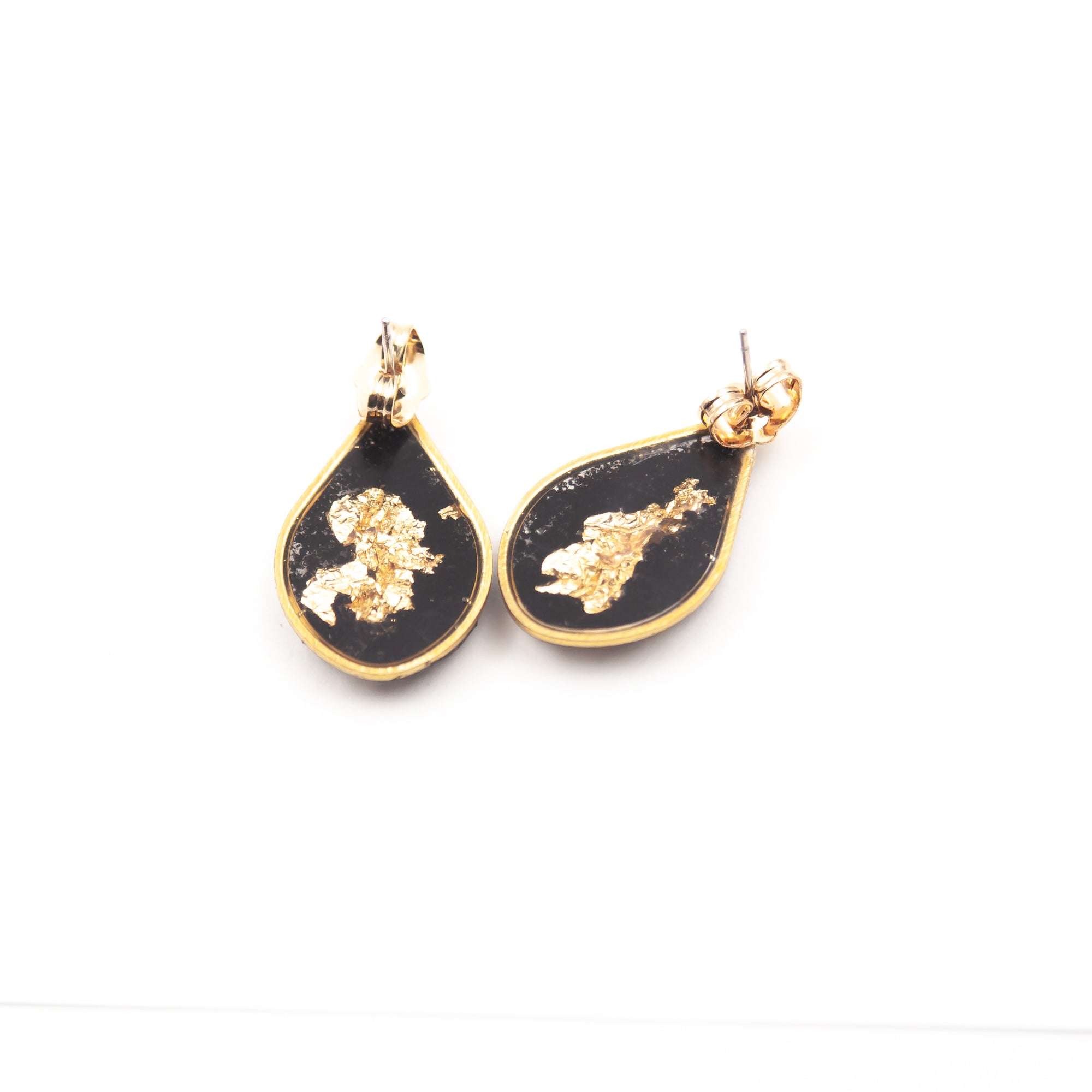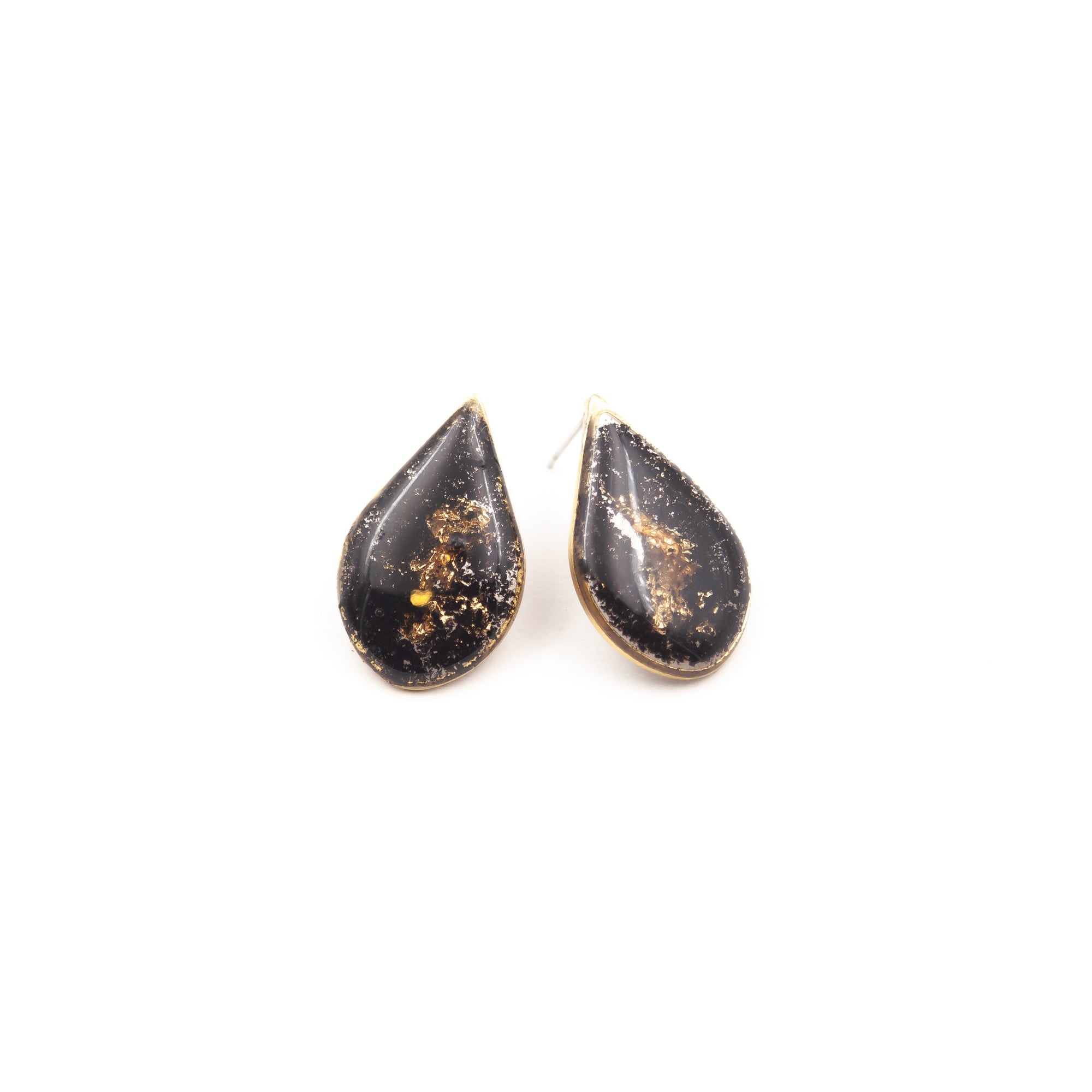 Un paio di orecchini dal carattere intenso, dove il buio incontra la luce. L’ottone incornicia due gocce in resina trasparente che racchiudono fuliggine nera e frammenti di foglia dorata, creando riflessi unici e irripetibili.