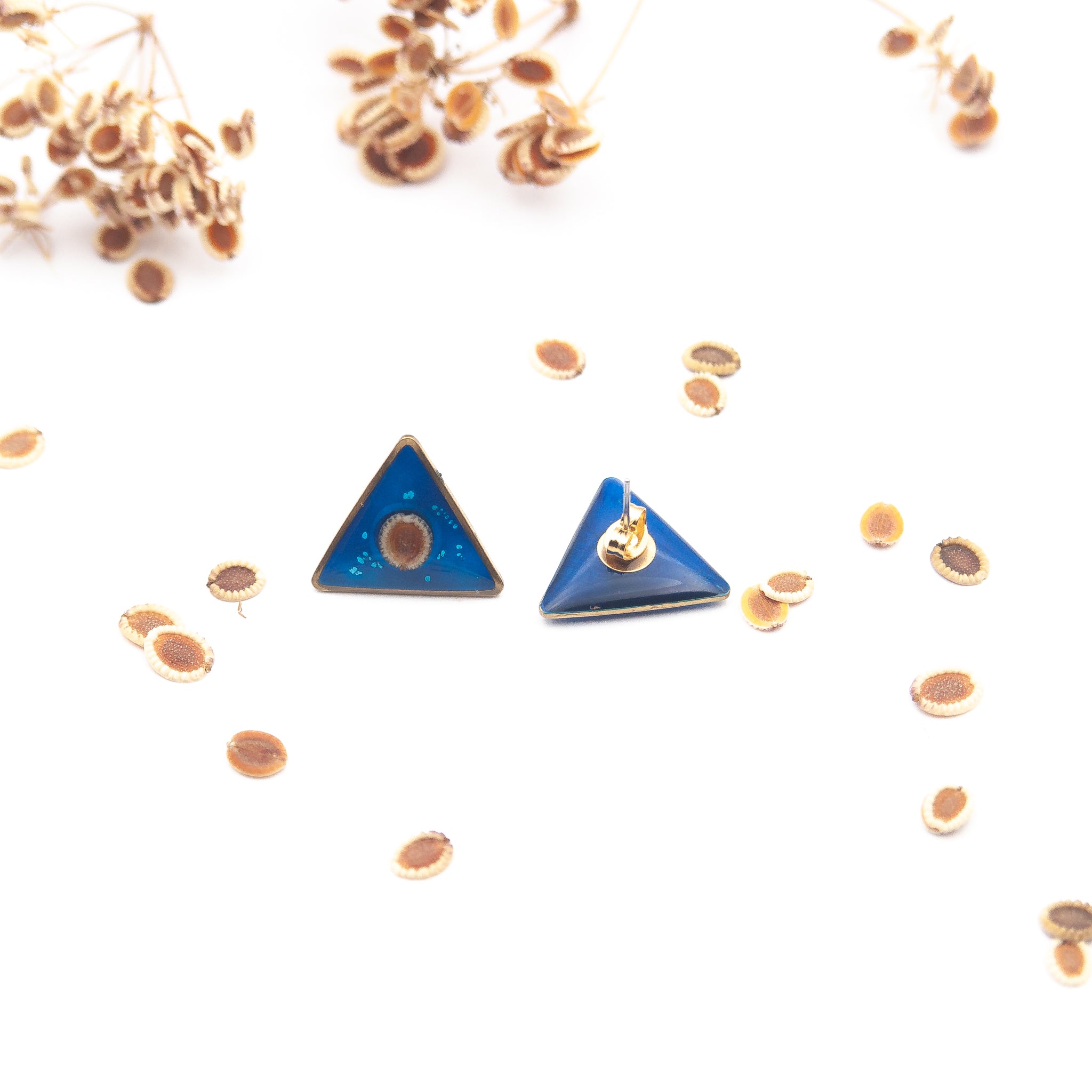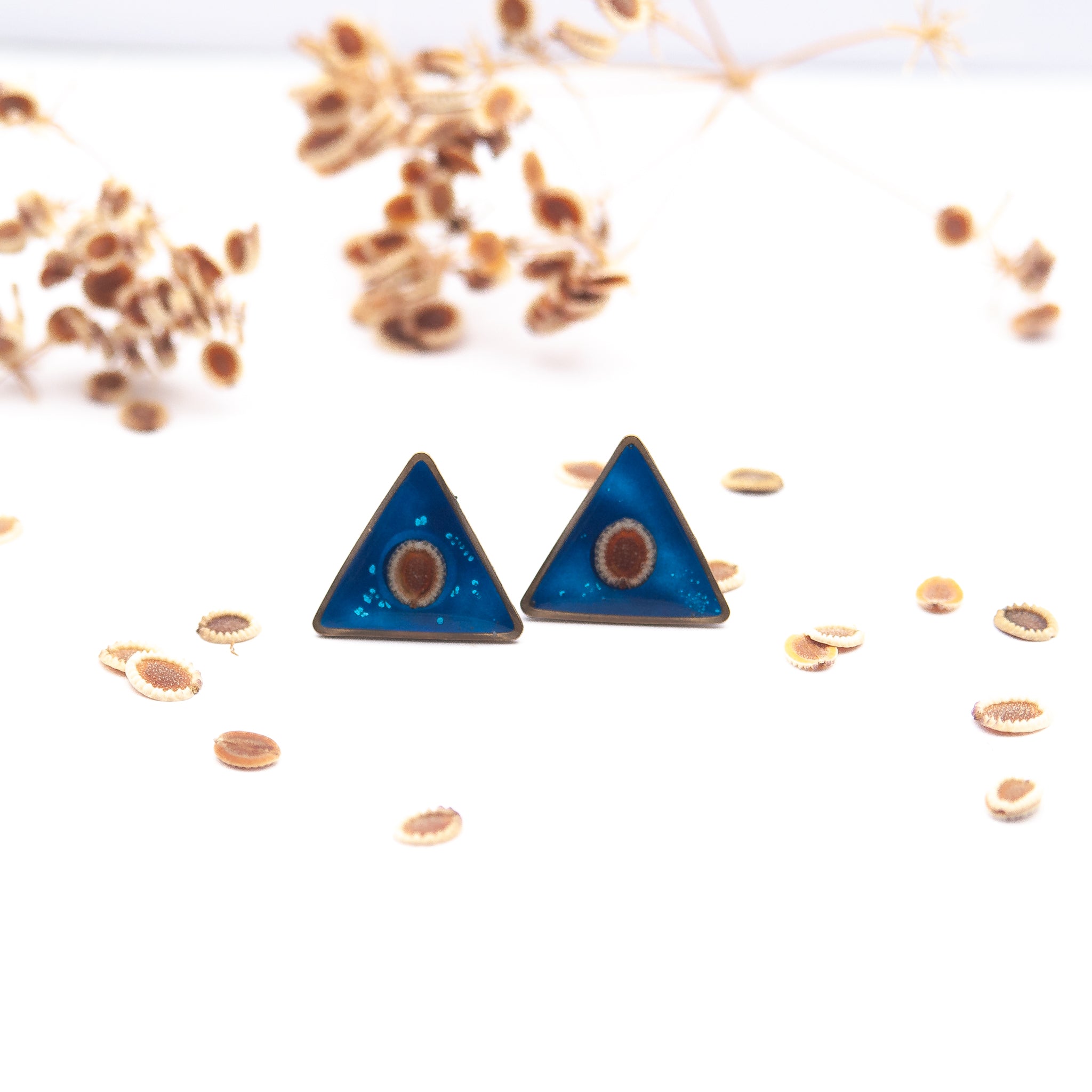 Questi orecchini racchiudono i semi di ombrellino pugliese, una pianta spontanea che sorprende per la sua forma elegante e geometrica. I semi, con il loro disegno naturale che ricorda un piccolo occhio, risaltano su uno sfondo blu intenso, creando un contrasto raffinato e suggestivo. Un gioiello dal design essenziale, che celebra la forza e la semplicità della natura.