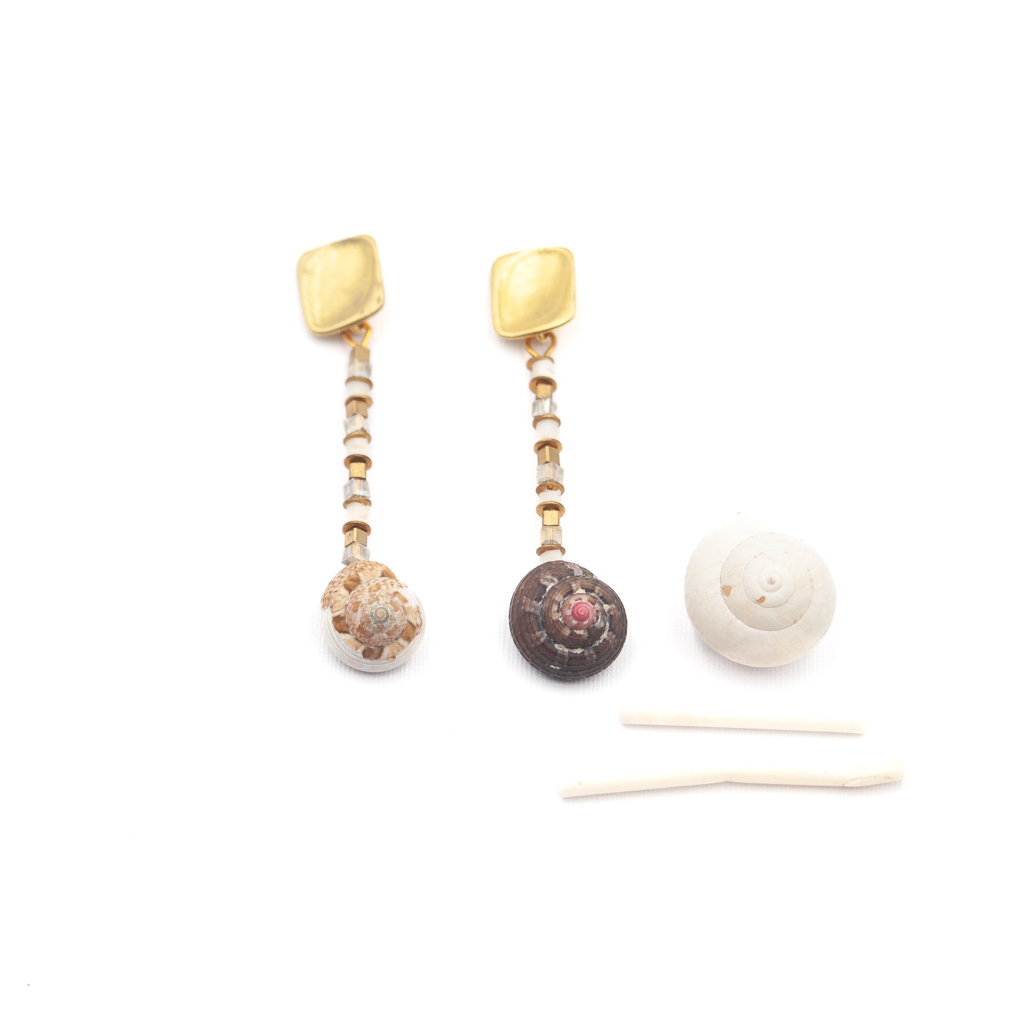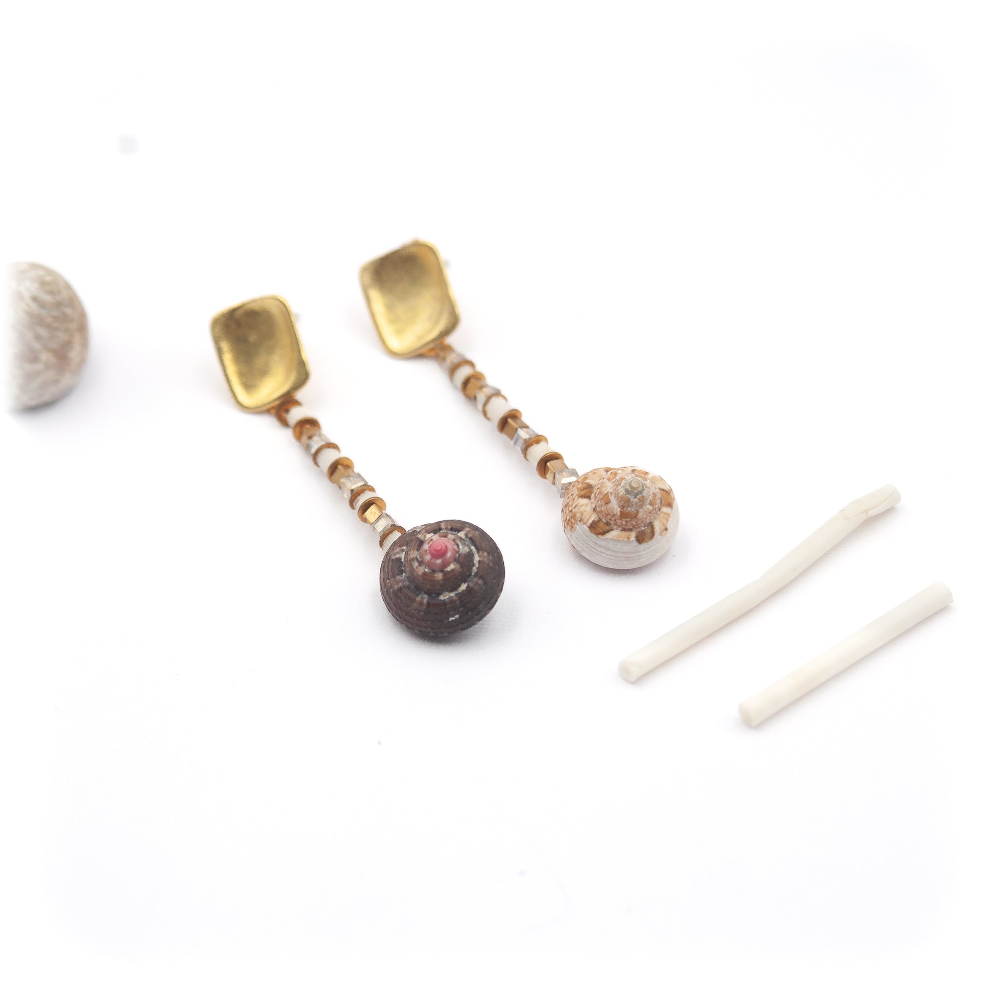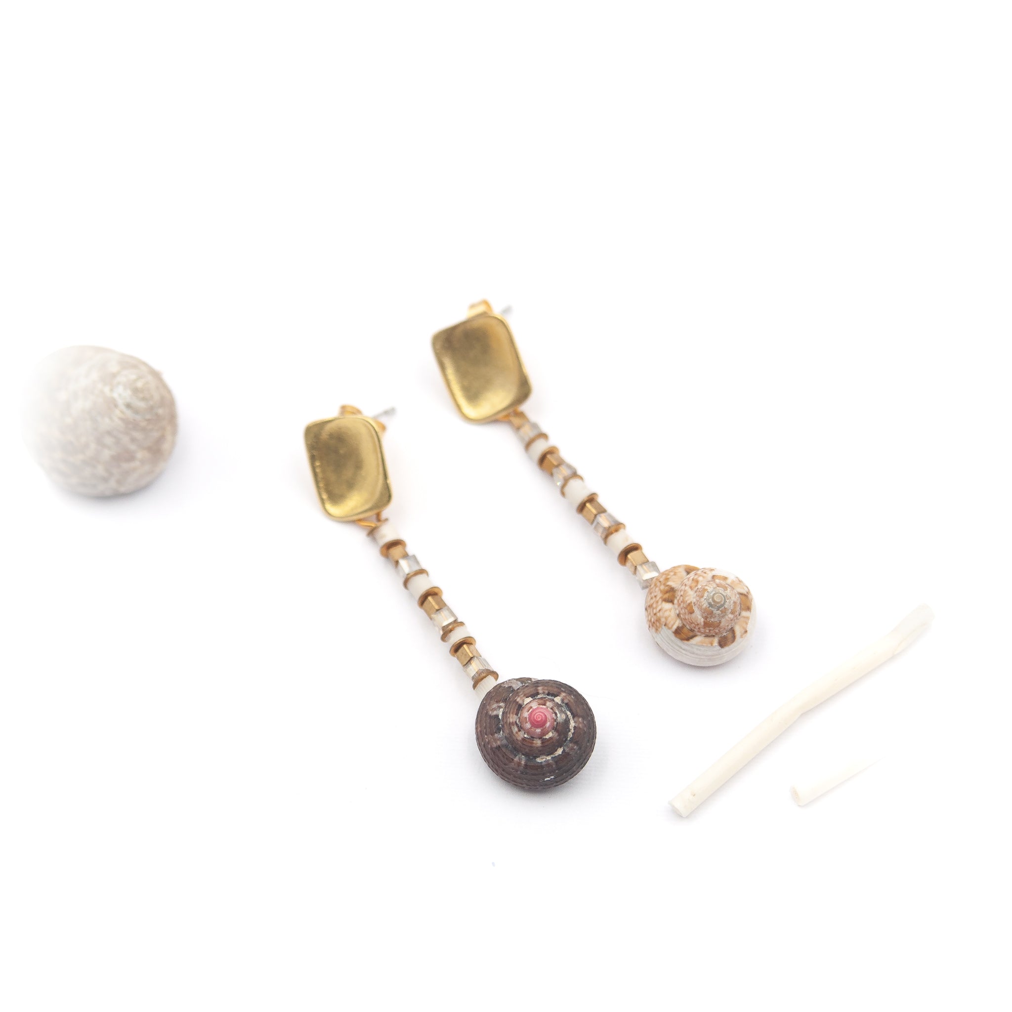 La montatura in ottone e la linea pendente donano leggerezza e movimento, mentre ogni coppia di conchiglie, con le loro forme e sfumature, rende ogni pezzo irripetibile. Un accessorio che non solo decora, ma porta con sé un messaggio sul mare e la sua fragilità.