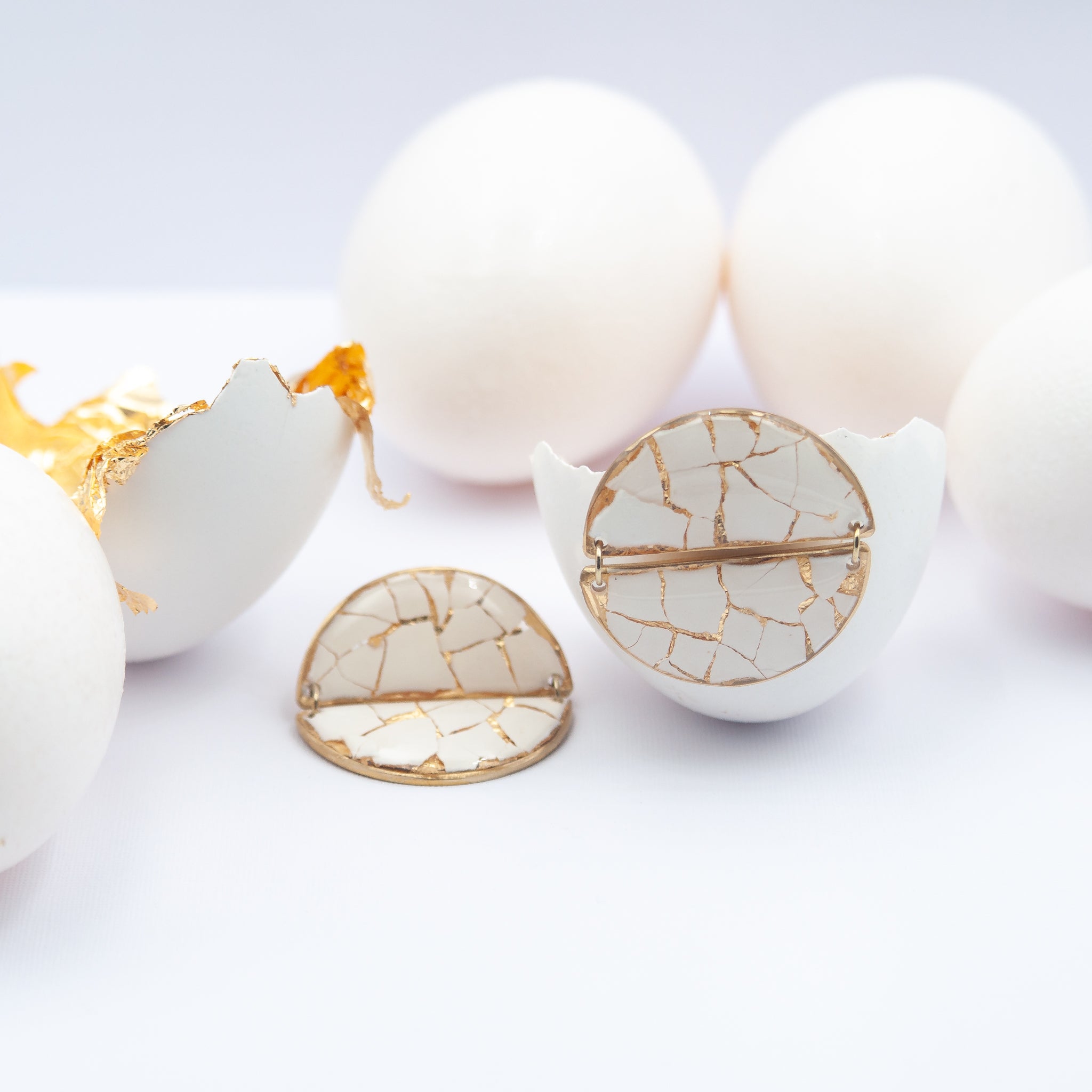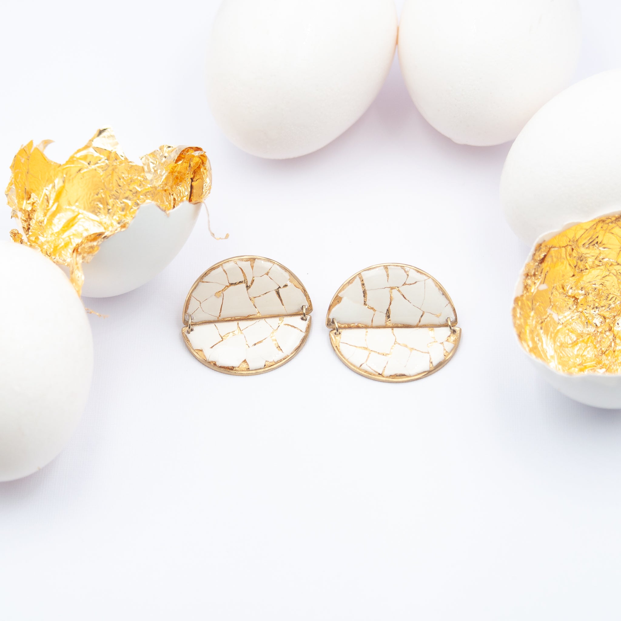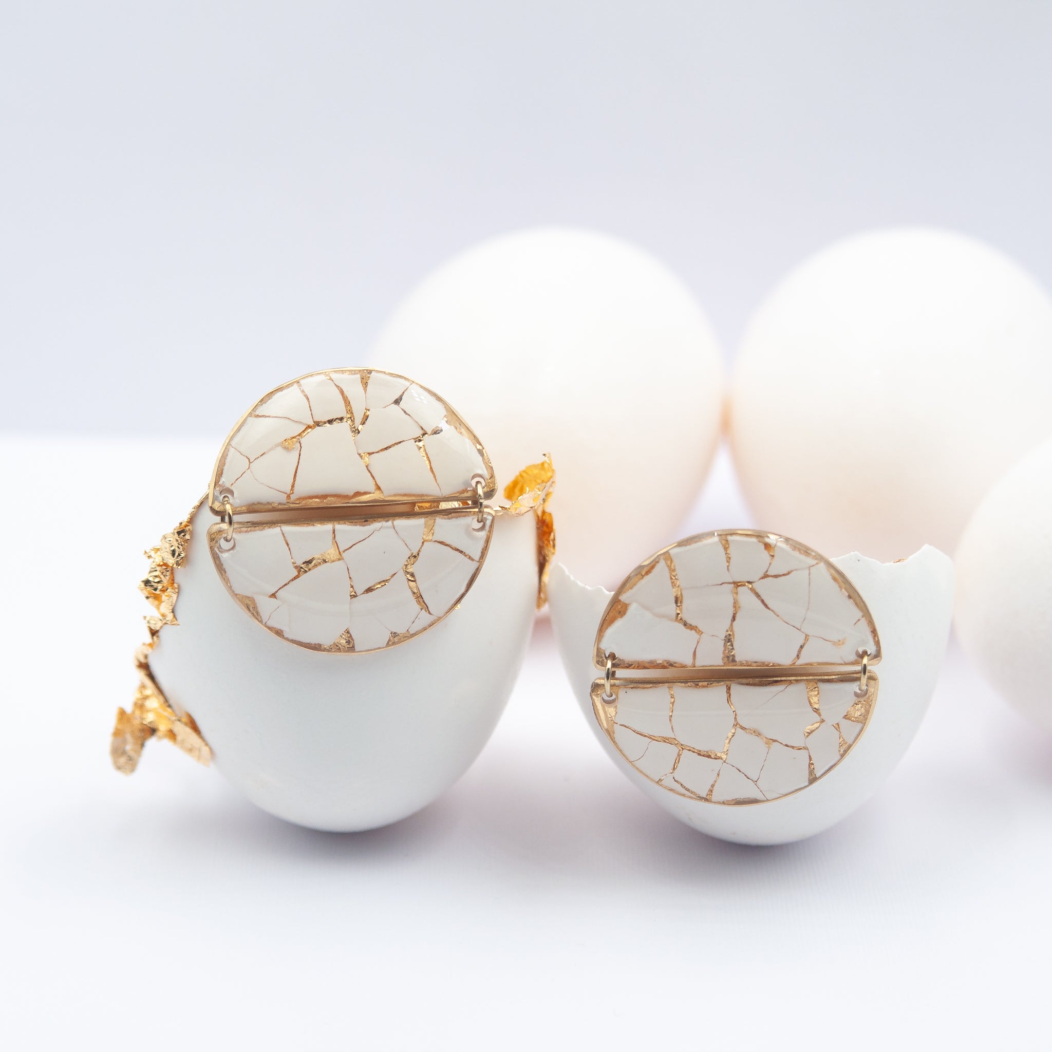Questi orecchini trasformano la fragilità in bellezza: gusci d’uovo ricomposti con frammenti di foglia dorata, che disegnano trame irregolari e preziose. Ogni coppia è un pezzo unico, simbolo di rinascita e leggerezza, capace di unire delicatezza e forza interiore.